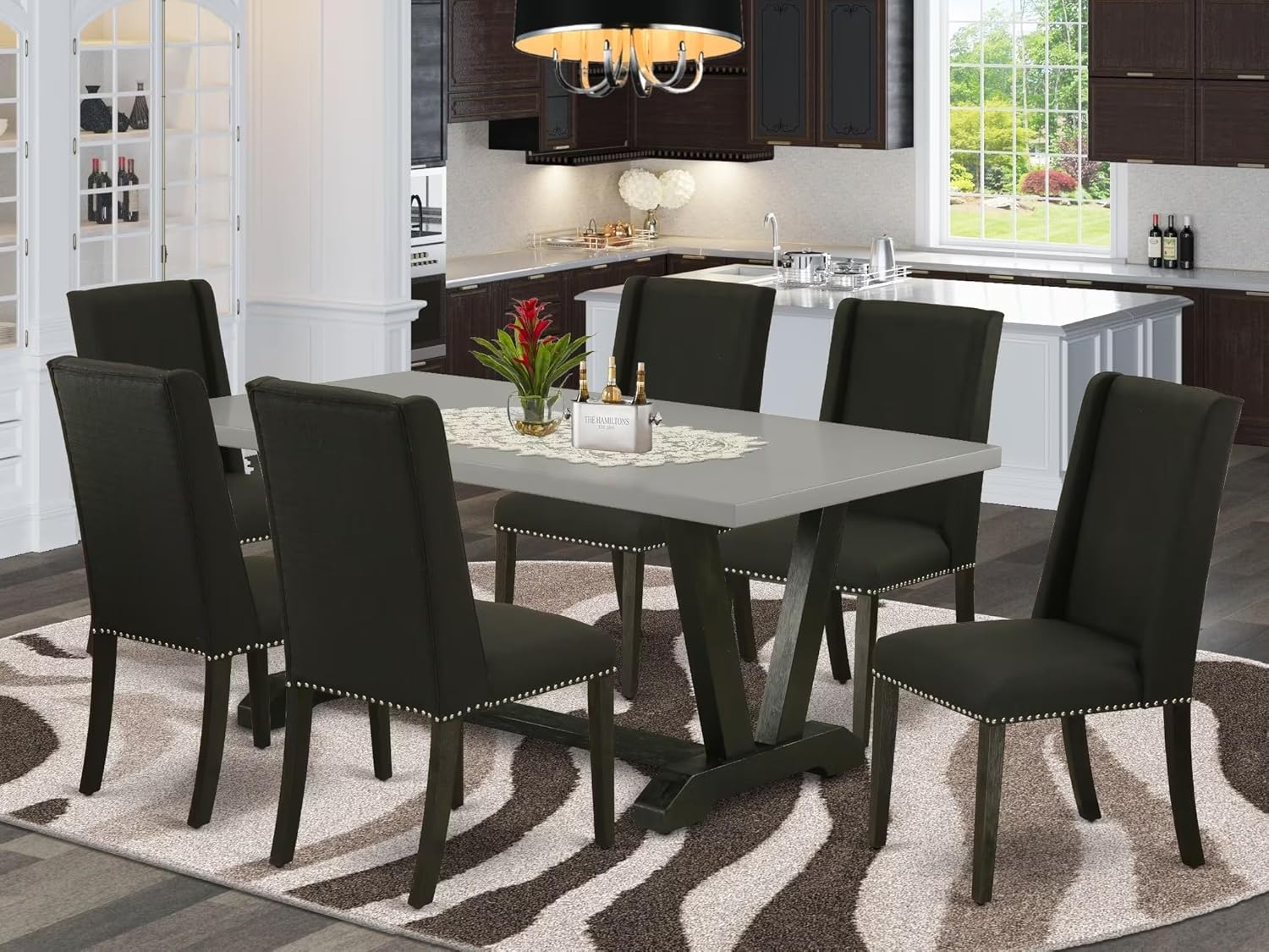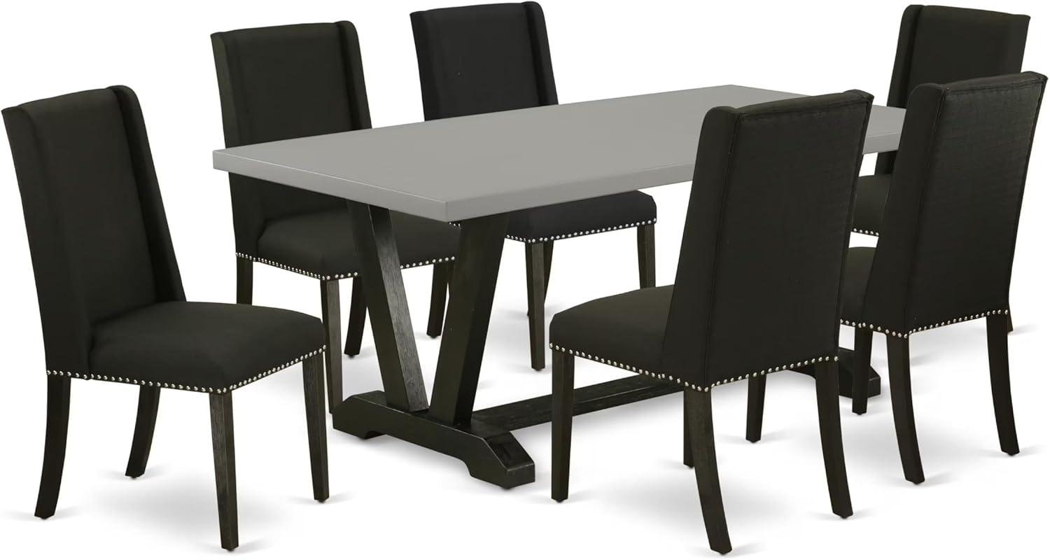 East West Furniture V697FL624-7 7 Piece Modern Dining Table Set Consist of a Rectangle Wooden Table with V-Legs and 6 Black Linen Fabric Parson Dining Chairs, 40x72 Inch, Multi-Color