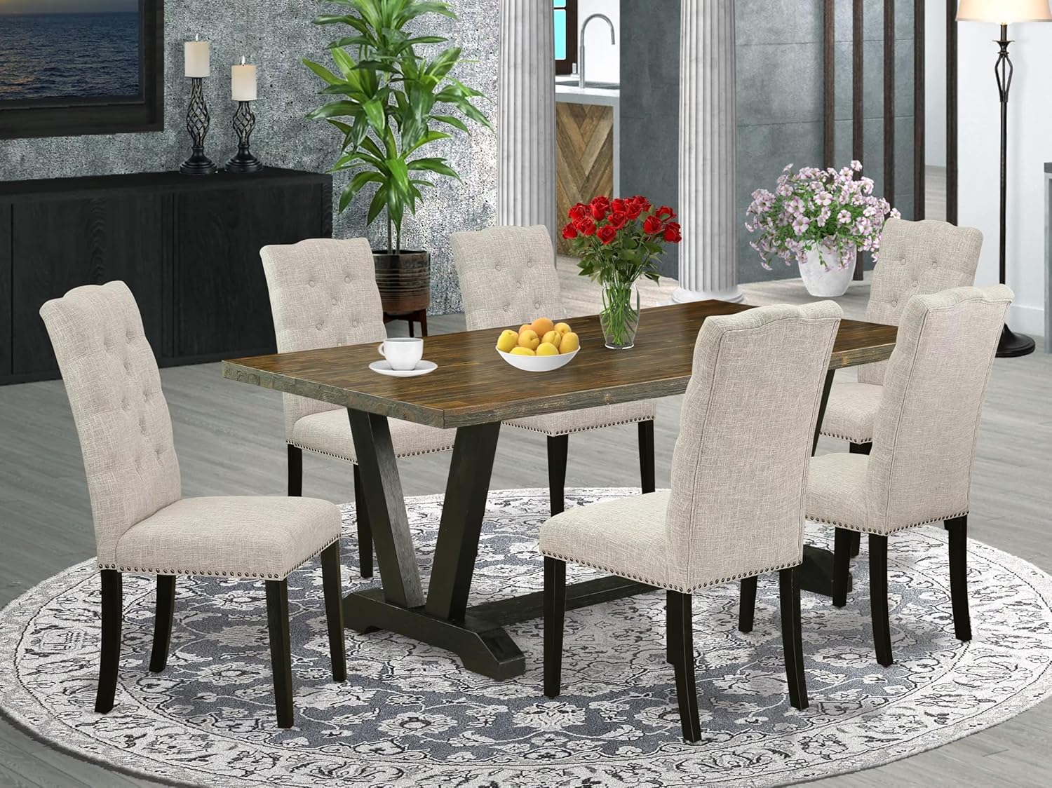 East West Furniture V677EL635-7 7 Piece Kitchen Table & Chairs Set Consist of a Rectangle Dining Room Table with V-Legs and 6 Doeskin Linen Fabric Parsons Chairs, 40x72 Inch, Multi-Color