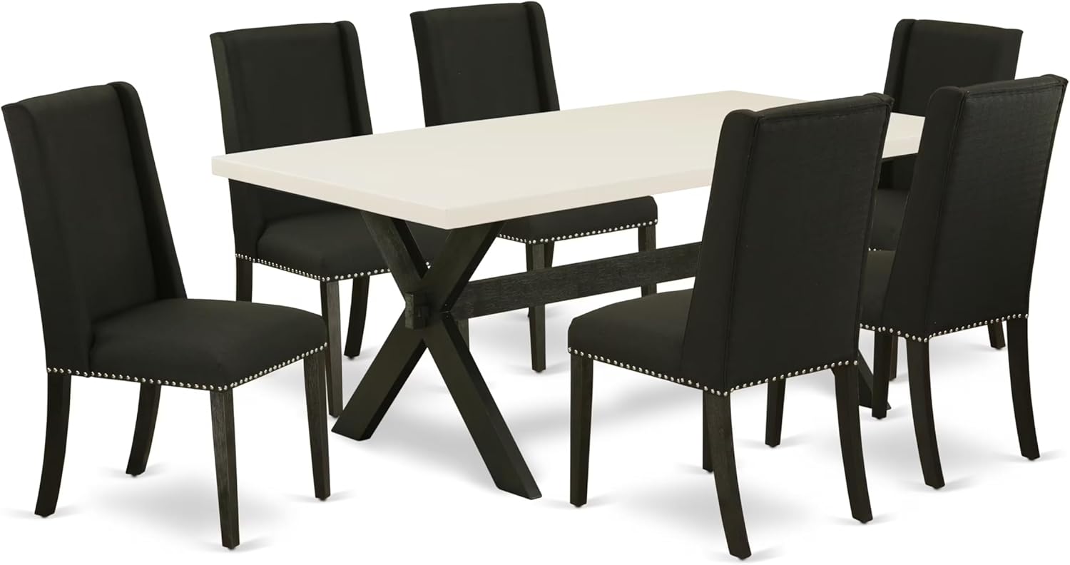 East West Furniture X627FL624-7 7 Piece Modern Dining Table Set Consist of a Rectangle Wooden Table with X-Legs and 6 Black Linen Fabric Upholstered Chairs, 40x72 Inch, Multi-Color