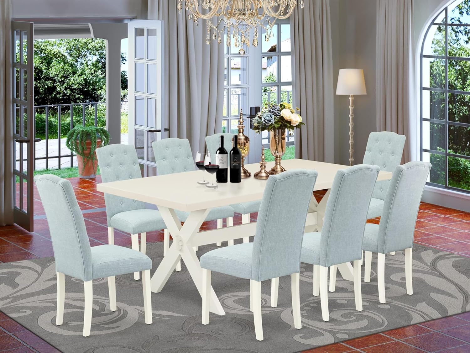 East West Furniture X027CE215-9 9 Piece Dining Table Set Includes a Rectangle Dining Room Table with X-Legs and 8 Baby Blue Linen Fabric Upholstered Parson Chairs, 40x72 Inch, Multi-Color