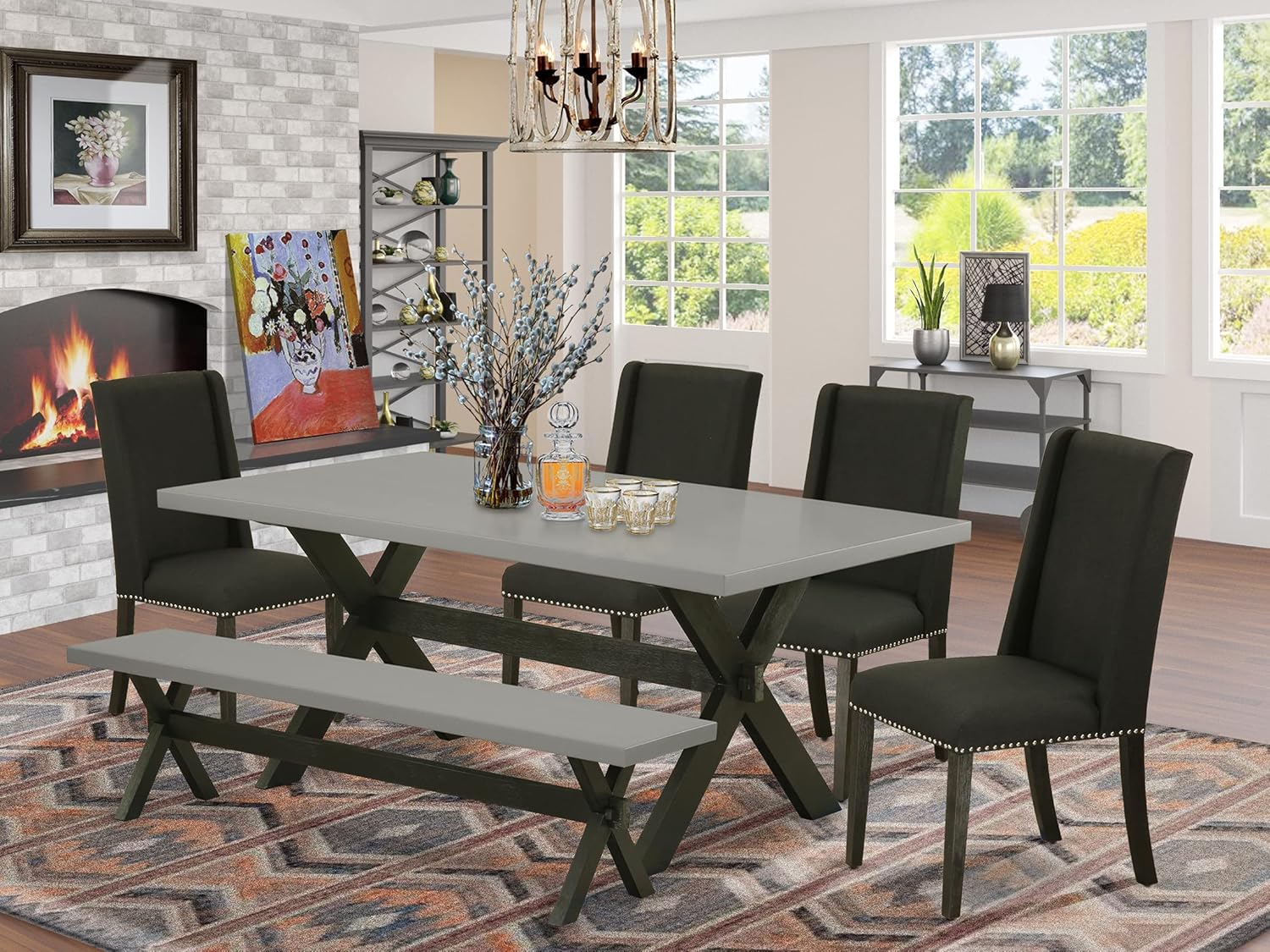 East West Furniture X697FL624-6 6 Piece Dinette Set Contains a Rectangle Dining Table with X-Legs and 4 Black Linen Fabric Parson Chairs with a Bench, 40x72 Inch, Multi-Color