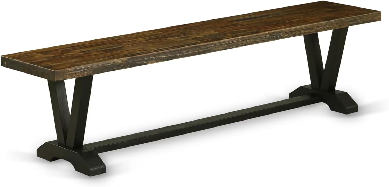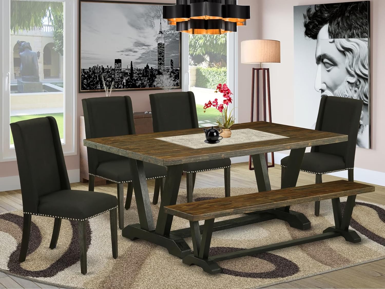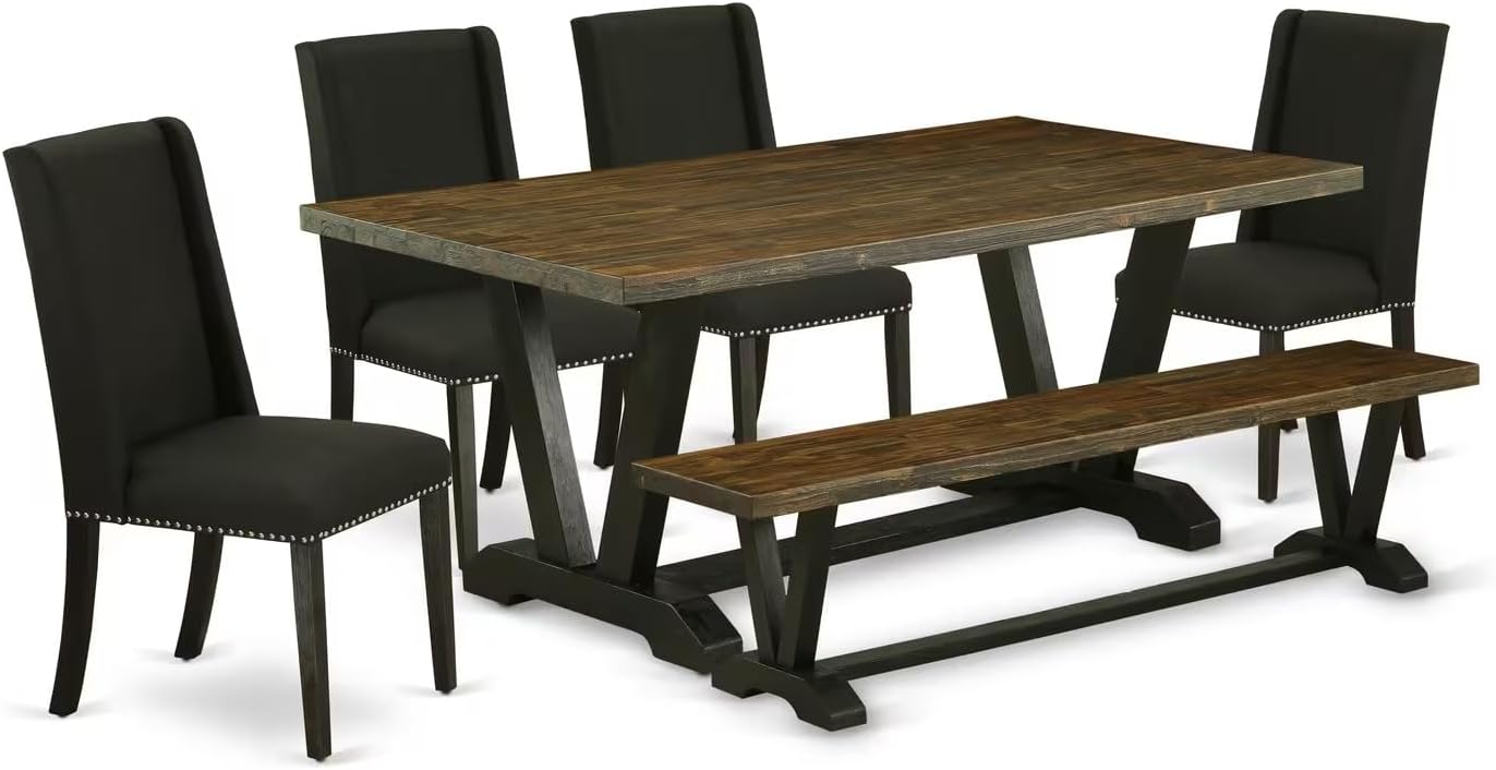 East West Furniture V677FL624-6 6 Piece Dining Room Set Contains a Rectangle Dining Table with V-Legs and 4 Black Linen Fabric Parson Chairs with a Bench, 40x72 Inch, Multi-Color