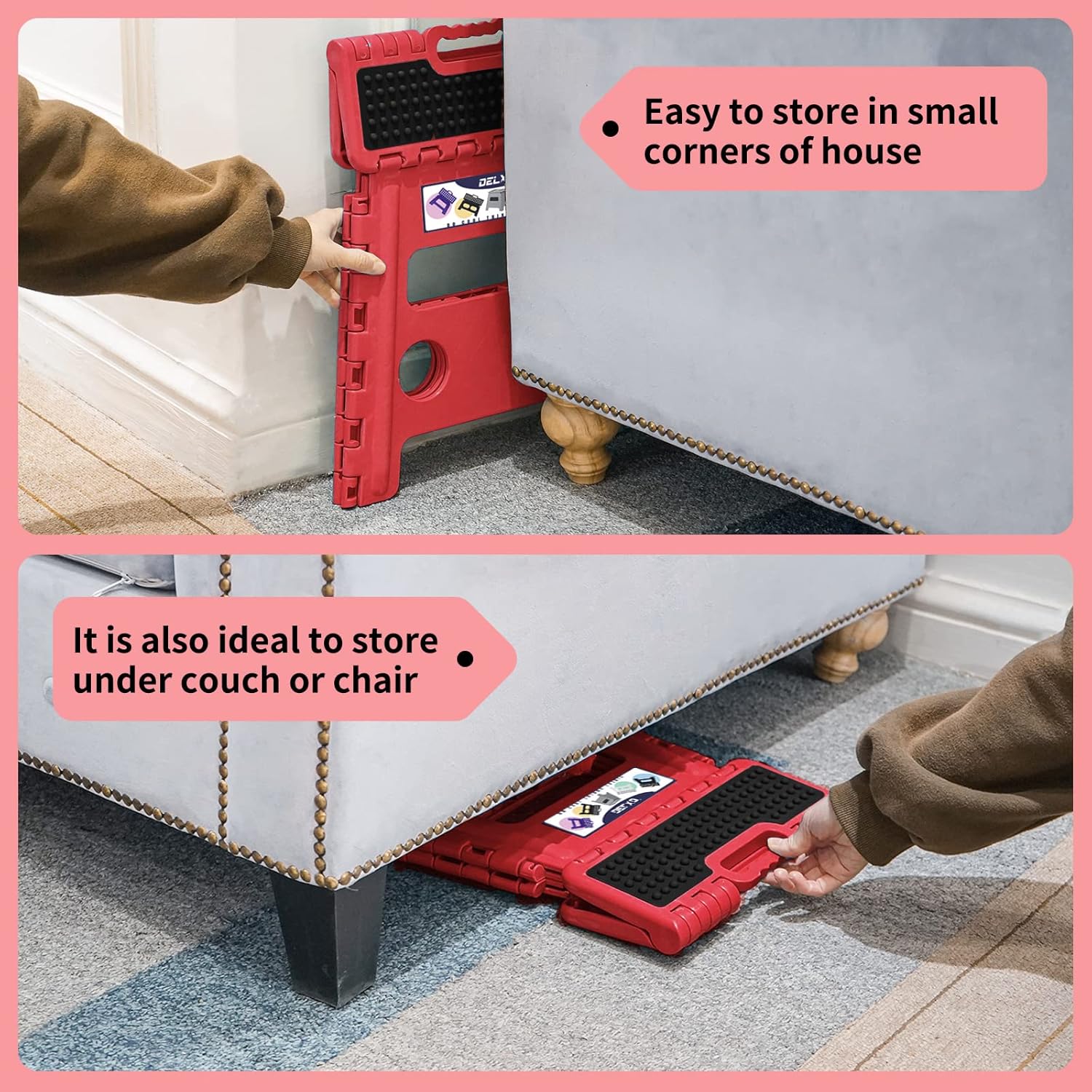 - Space Saving Foldable Stool : Delxo step stool save your closet space more than 90% when it folded up.It's quickly and easily folds away for convenient storage so you can opens with one flip of the hand.Also you can hides them in corner at home because it's so compact
