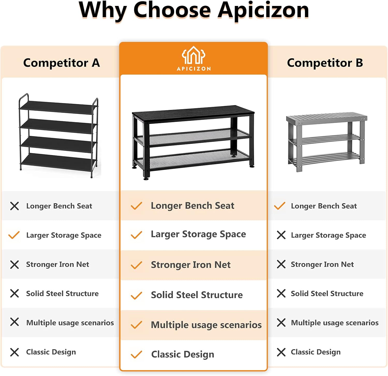 Apicizon Shoe Rack, 35.5 Inches 3-Tier Shoe Rack for Entryway with Long Seat and Metal Shelves for Garage, Industrial Storage Bench with Steel Structure for Living Room, Bedroom, Mudroom, Black