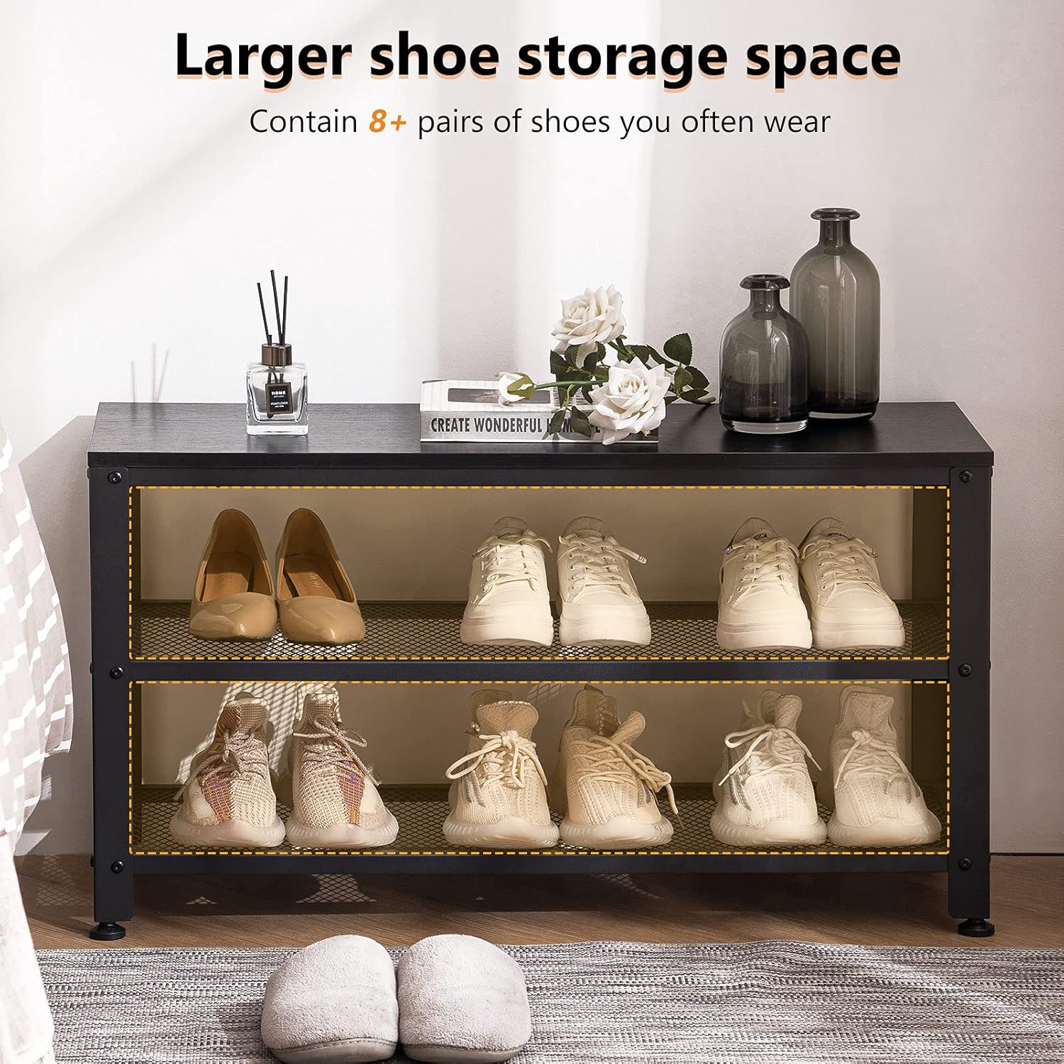 - 【STURDY SHOE RACK】The shoe rack is made of sturdy steel and particle board construction, so you don't have to worry about wood cracking, bending, or rusting issues. It can support up to 300 pounds, allowing you to sit on the entryway bench and comfortably put on your shoes without any rush.