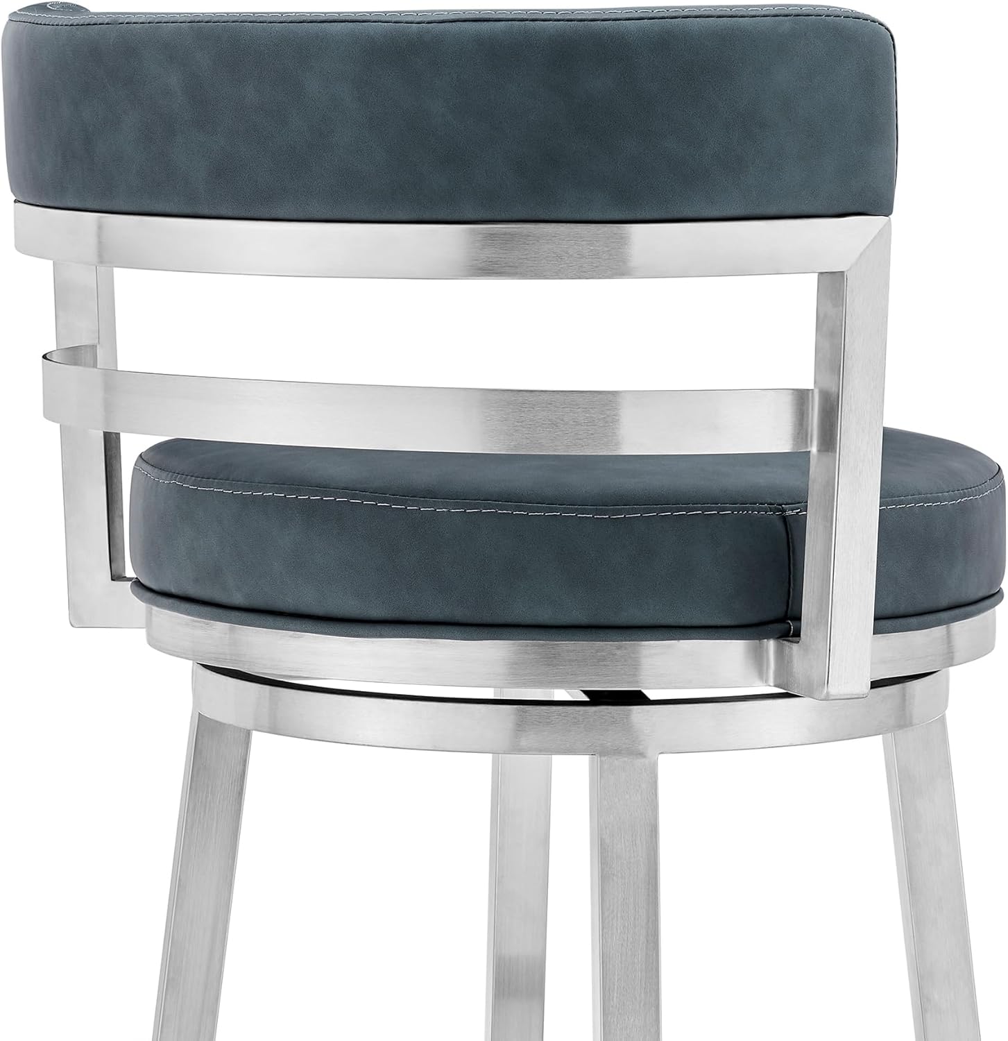 Armen Living Madrid 26" Seat Height Swivel Modern Blue Faux Leather and Brushed Stainless Steel Bar Stool for Kitchen Island Counter