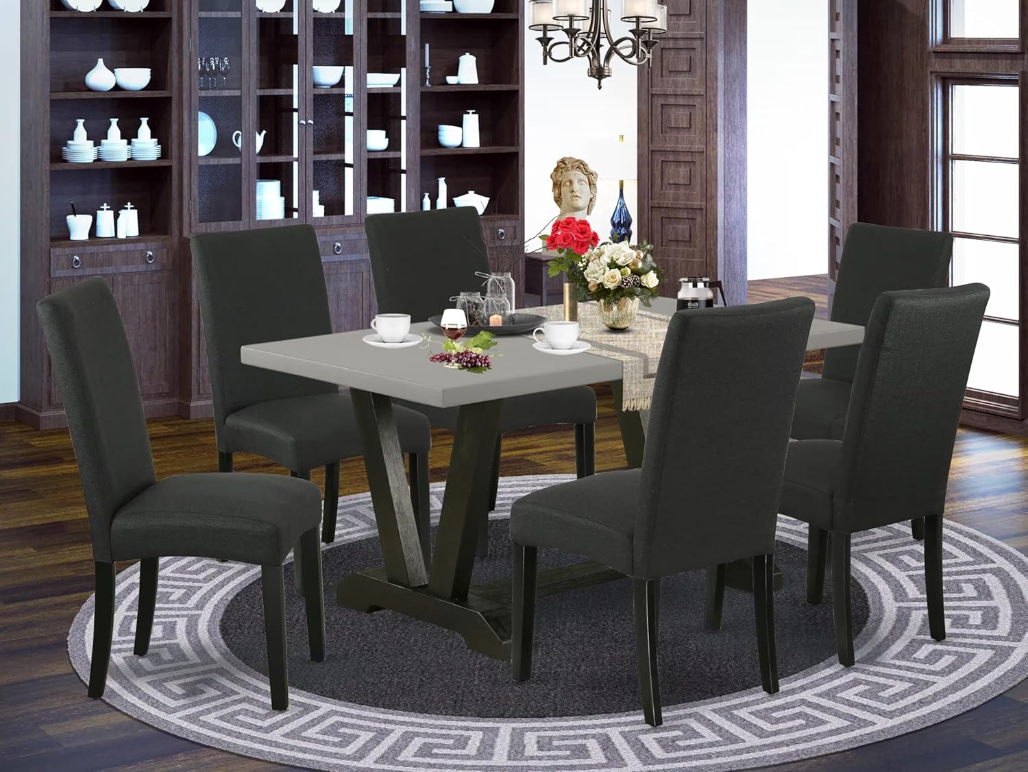 - DINING TABLE SET FINISH: This fantastic dining table boasts a cement rectangular top paired with sleek black wire-brushed wooden legs. Complementing this ensemble are our parson chairs, featuring a black-finished frame, linen fabric seats, and stylish black chair backs. The exquisite combination of this breakfast table and mid-century dining chairs effortlessly complements any room decor style.