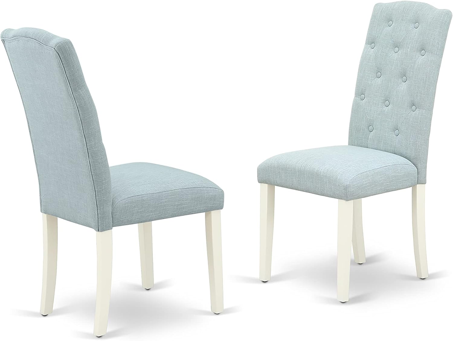 - DINNING ROOM CHAIR SEAT MATERIAL: The dining table and wooden dining bench are characterized by a rectangular top and robust wooden cross legs. These dining chairs are designed with customer comfort in mind, featuring a Baby Blue Linen Fabric seat, Button Tufted Chair Back, and a stable structure. The classic design of this unique dining table set seamlessly integrates with various decor styles.