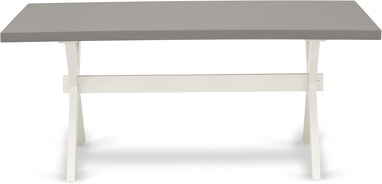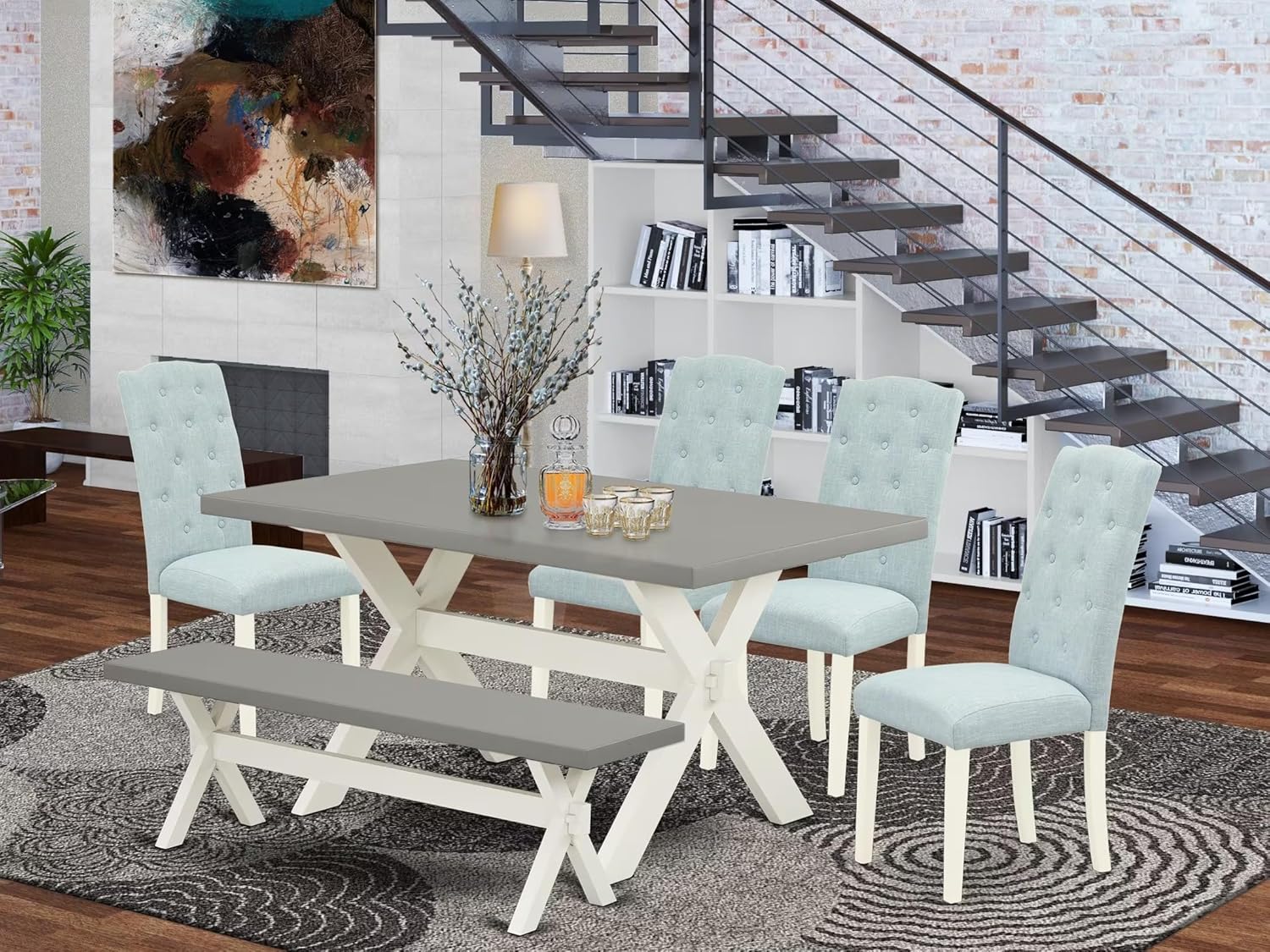 - WOOD TABLE SET FINISH: Our modern dining table features a sleek Cement rectangular top and Wire Brushed Off-White wooden cross legs. The kitchen chairs are elegantly crafted with Off-White finish frames, Linen Fabric seats, and Baby Blue Button Tufted Chair Backs. The accompanying wood bench complements the set with a Cement top and Wire Brushed Off-White legs.
