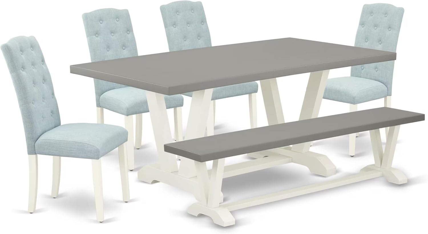 East West Furniture V097CE215-6 6 Piece Dining Set Contains a Rectangle Dining Room Table with V-Legs and 4 Baby Blue Linen Fabric Upholstered Chairs with a Bench, 40x72 Inch, Multi-Color