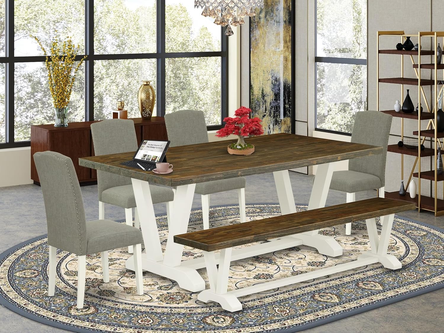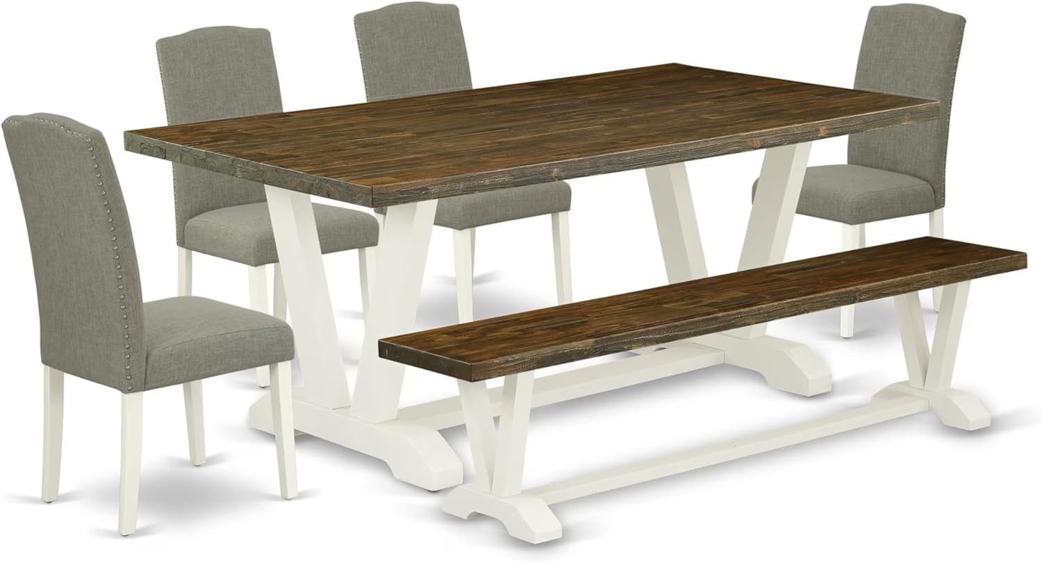 East West Furniture V077EN206-6 6 Piece Dinette Set Contains a Rectangle Dining Table with V-Legs and 4 Dark Shitake Linen Fabric Parson Chairs with a Bench, 40x72 Inch, Multi-Color