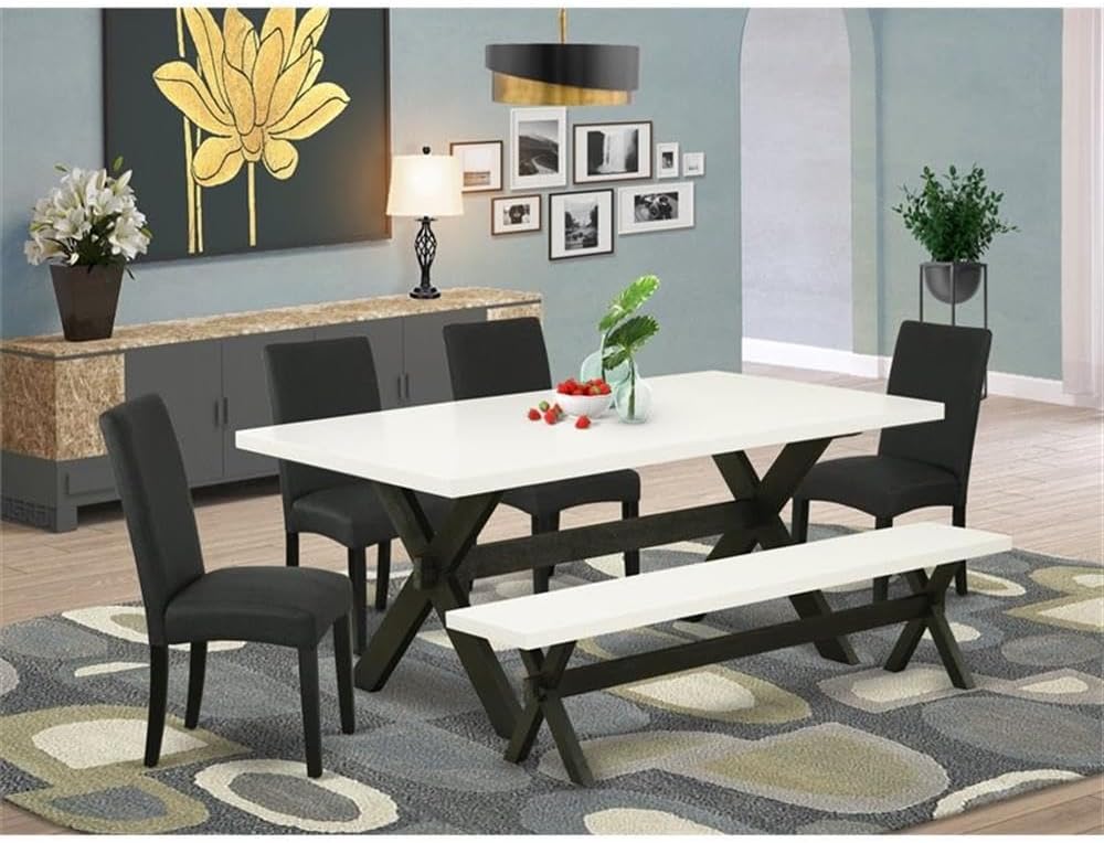 East West Furniture X627DR124-6 6 Piece Dining Table Set Contains a Rectangle Wooden Table with X-Legs and 4 Black Color Linen Fabric Parson Chairs with a Bench, 40x72 Inch, Multi-Color