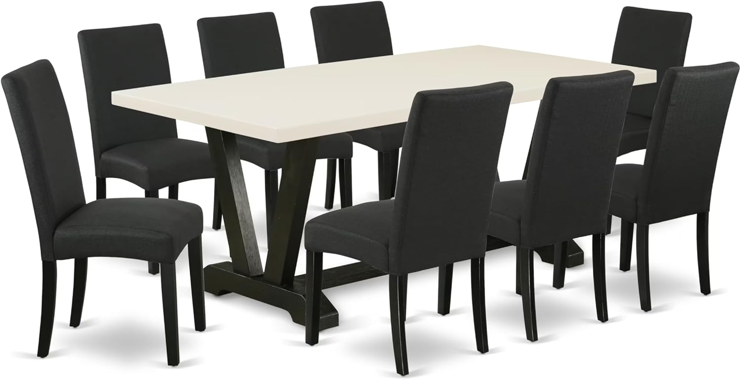 East West Furniture V627DR124-9 9 Piece Dining Set Includes a Rectangle Dining Room Table with V-Legs and 8 Black Color Linen Fabric Upholstered Parson Chairs, 40x72 Inch, Multi-Color