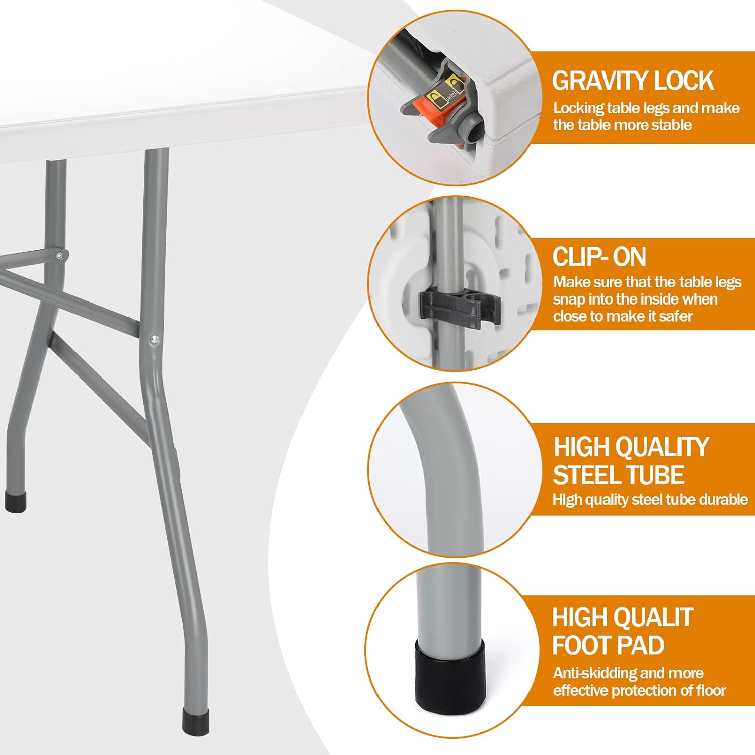 - 【HEAVY-DUTY TABLE TOP】:The picnic 6 foot folding table Mades of high-density polyethylene (HDPE), Place food, drinks, and much more on the strong, easy-to-clean table top with high-quality plastic up to 20% thicker than other brands, plus 3x the weight capacity at 330 lbs.