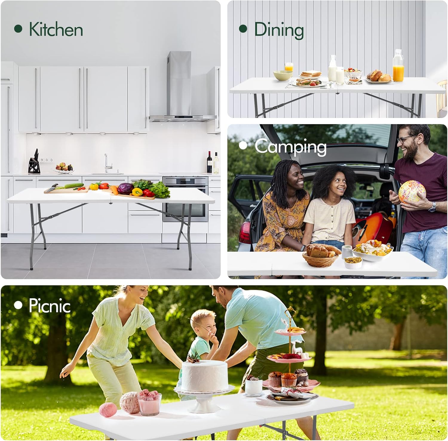 Folding Table 6ft Plastic Folding Table Indoor & Outdoor for Picnic, Camping,BBQ and Party, with Powder Coated Steel Legs and Built in Carry Handle, White