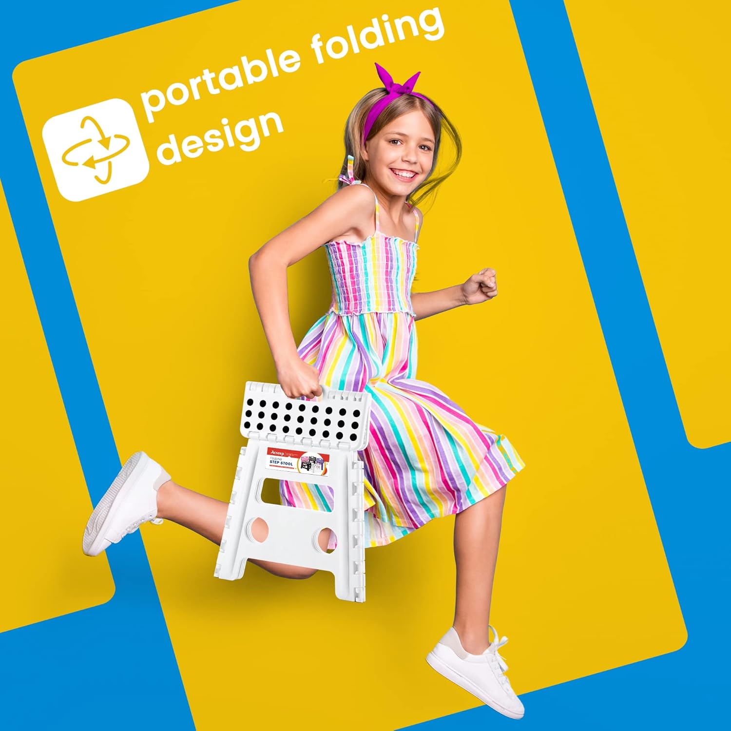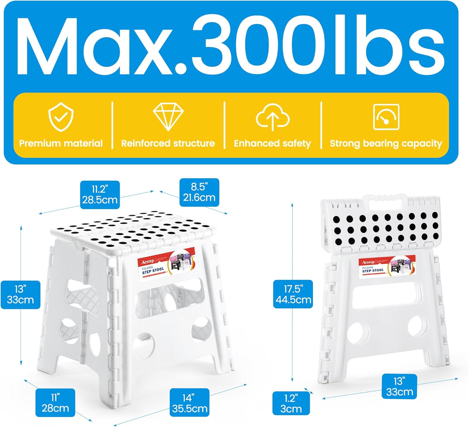 - ✔【Safe Upgrade Stand Stool】-Improved folding bar can prevent from collapse inward while standing on it. ACSTEP have designed a safety gap that allows the foldable stool to prevent being squashed, great for users. Four round corners protect your body from clashing. All of this design is put you safety first.