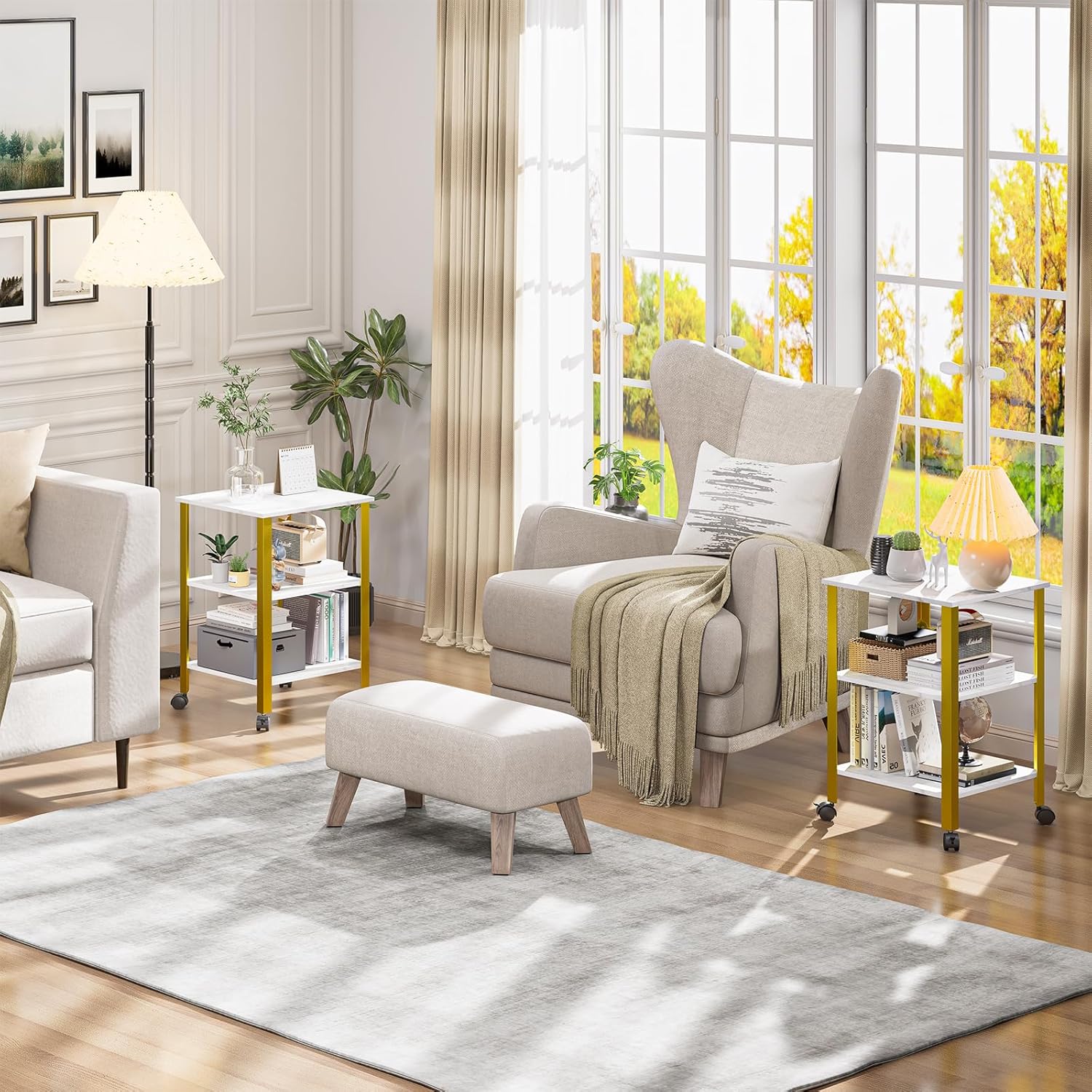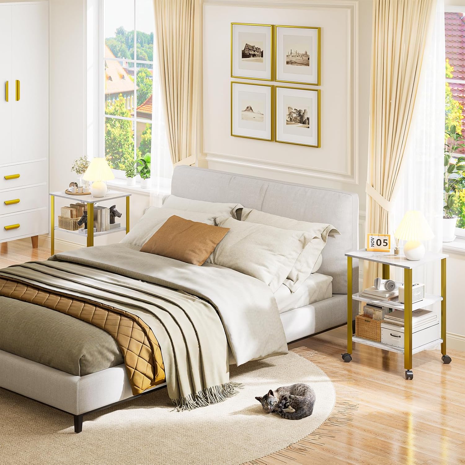 Side Table, End Table with Wheels, Printer Stand with 3-Tier Storage, Bedside Table,Telephone Table,Square Small Side Table for Living Room, Bedroom, Office, Kitchen, Metal Frame, Easy Assembly -White