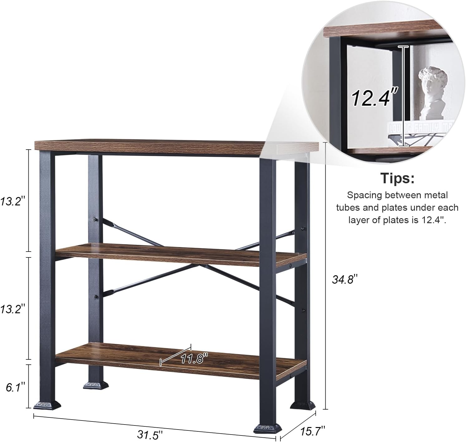 - 【Open Storage&Dimensions 】Overall size of small book shelf is 31.5” Wx15.7”Dx34.8” H and the height between each board is 12.4 inches.So this short book shelf can provide enough space to meet your daily storage needs.Whether you want to display books, CDS, collectibles, photos and so on.Its decoration and storage functions make your room elegant, simple and organized.