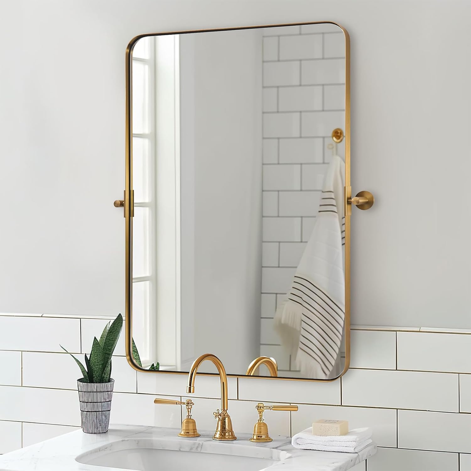 - EXCELLENT PERFORMANCE: Featuring a sleek look and functional details, our gold metal frame pivot mirror has a straightforward style that's incredibly timeless. Our classic brushed gold bathroom mirror is now available in a tilting angled design. Sturdy stainless steel wall bracket lets you adjust the angle of the gold rectangle mirror based on your preference and height.