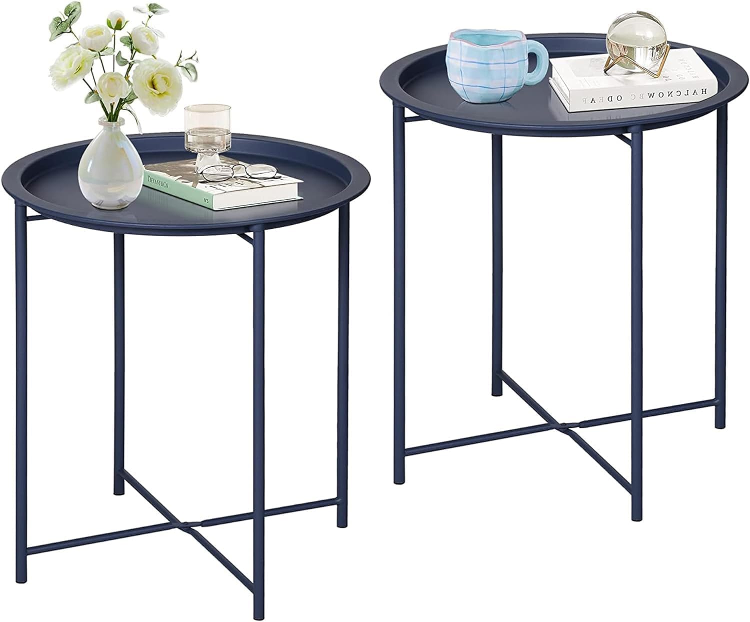 VECELO Side/End Table, Folding Round Metal Anti-Rust and Waterproof Outdoor or Indoor Tray for Living Room Bedroom Balcony and Office, 2 PCS, Blue