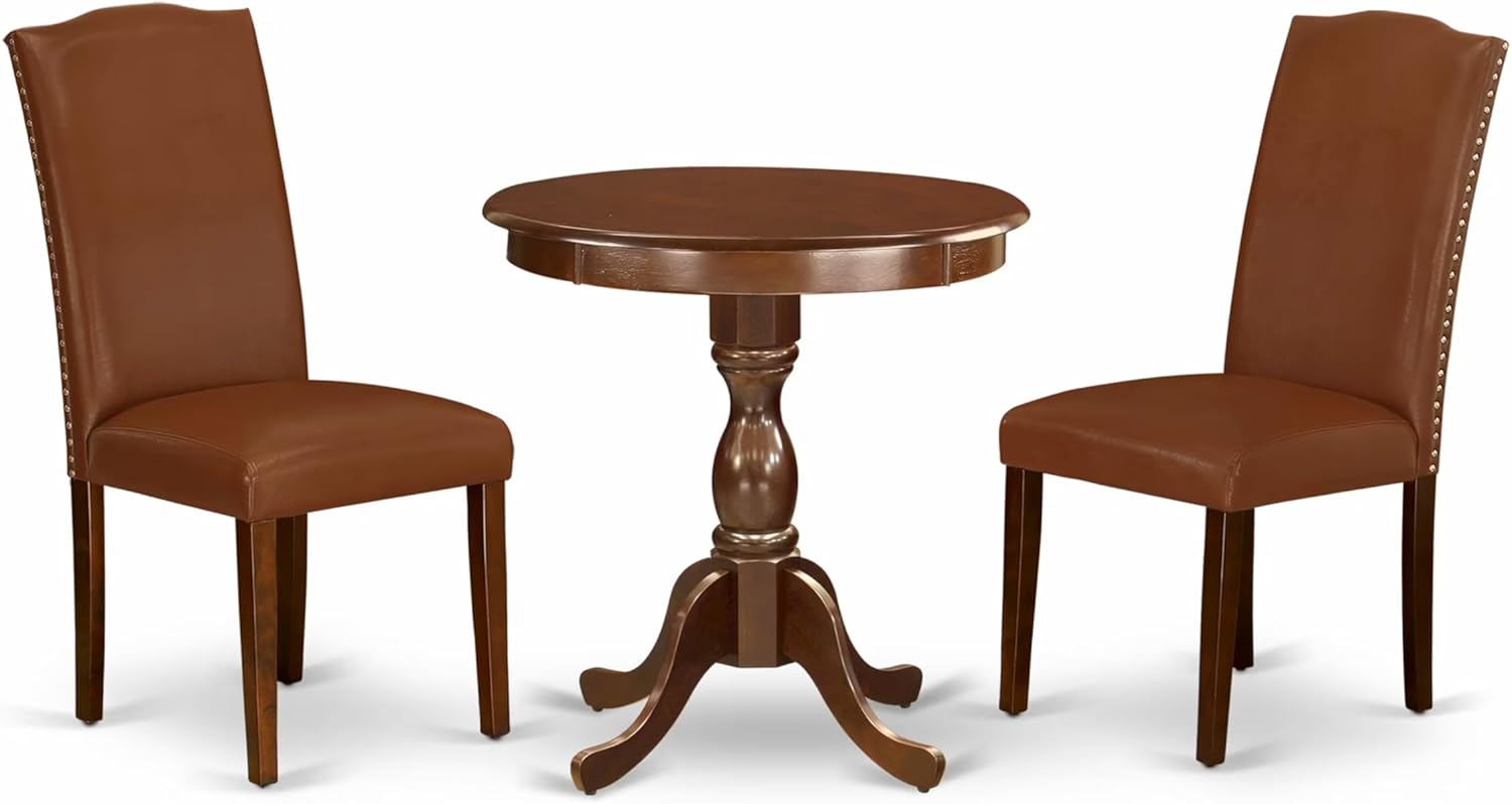 East West Furniture ESEN3-MAH-66 3 Piece Kitchen Table Set Contains a Round Dining Table and 2 Brown Faux Faux Leather Upholstered Chairs, 30x30 Inch, Mahogany