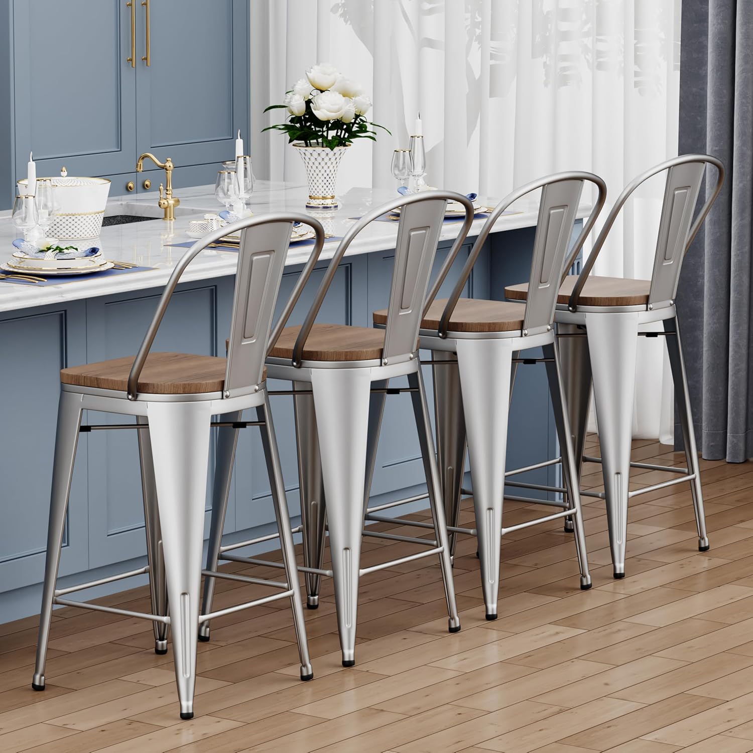 Yongqiang 24 inch Bar Stools Set of 4 High Back Kitchen Counter Height Bar Chairs Silver Metal Barstools with Large Wooden Seat