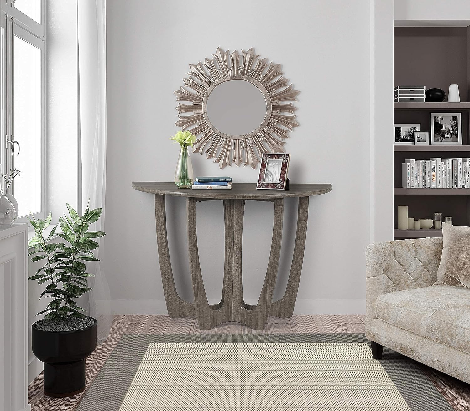 - [ Practical and Durable ]: Half moon accent foyer console table dimensions are 43 x 30 x 17 ''. The narrow console table is constructed in a graceful smart structure while keeping lightweight to be moved around easily. Besides, the accent sofa table with curved legs brings a sense of rustic and vintage to your sofa, entryway and foryer.