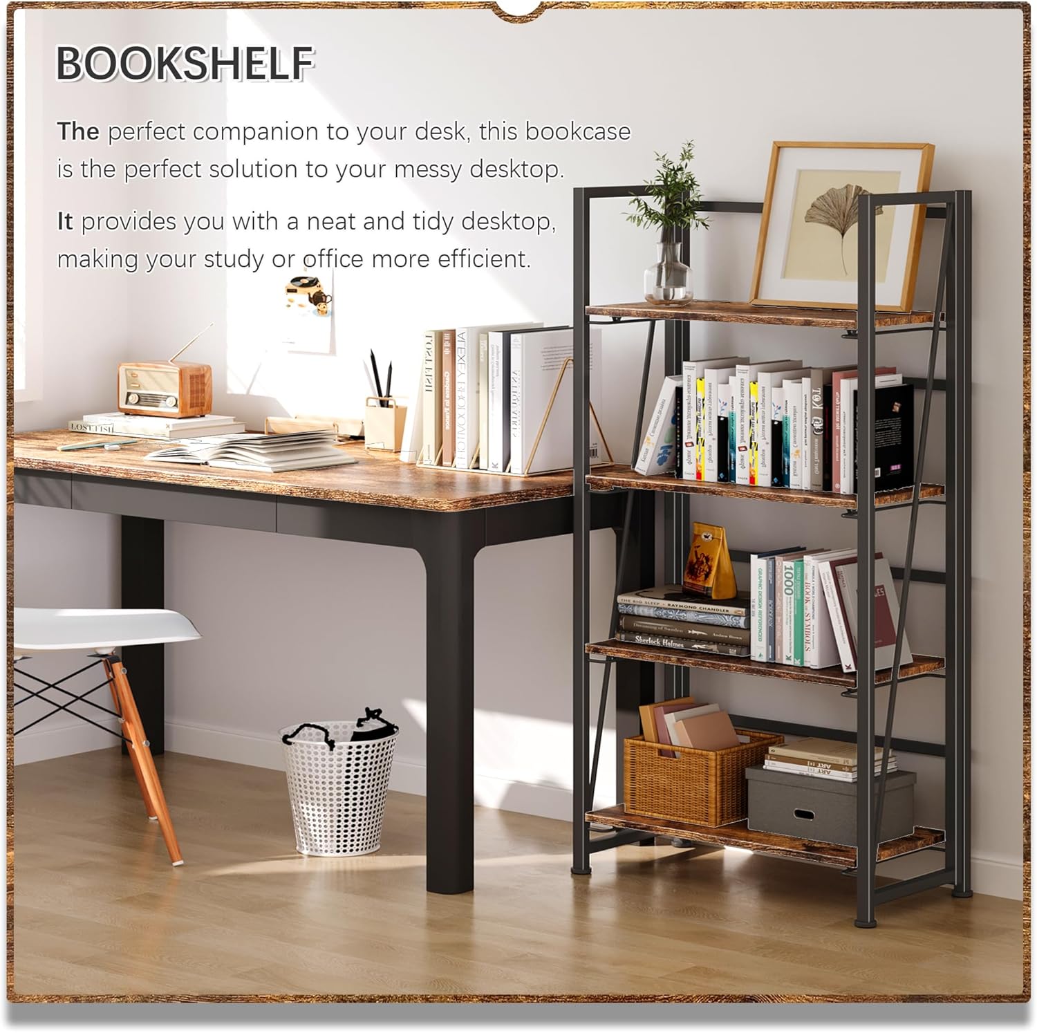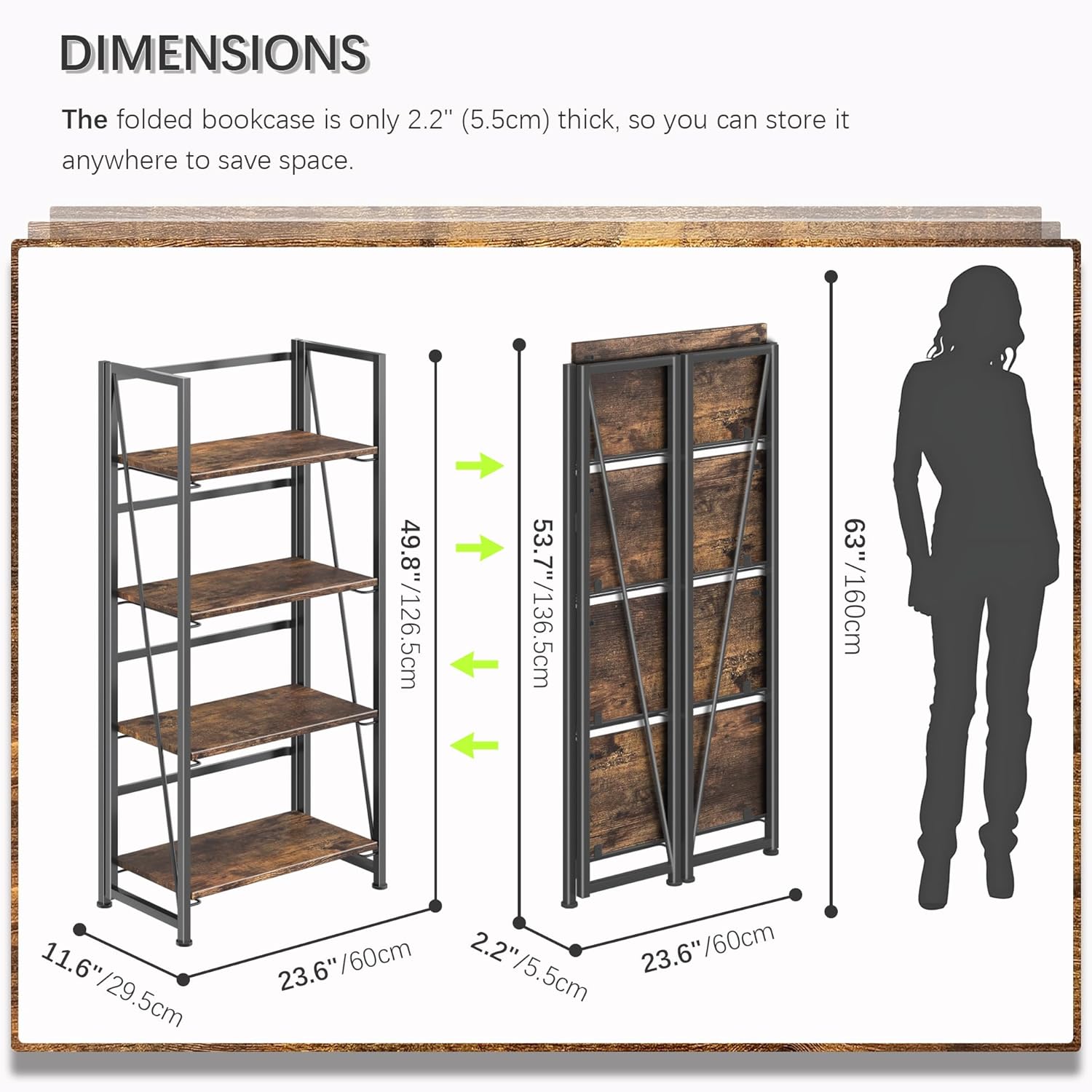 4NM No-Assembly Folding Bookshelf Storage Shelves 4 Tiers Vintage Bookcase Standing Racks Study Organizer Home Office (Rustic Brown Black)