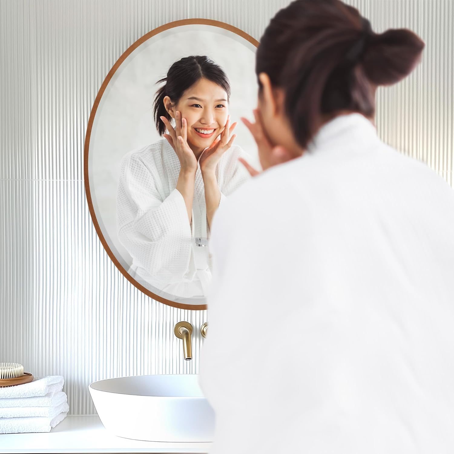 - ½” wide oval wood frame with a front-mounted mirror that appears to float. 1" beveled distortion-free mirror for added depth and clarity