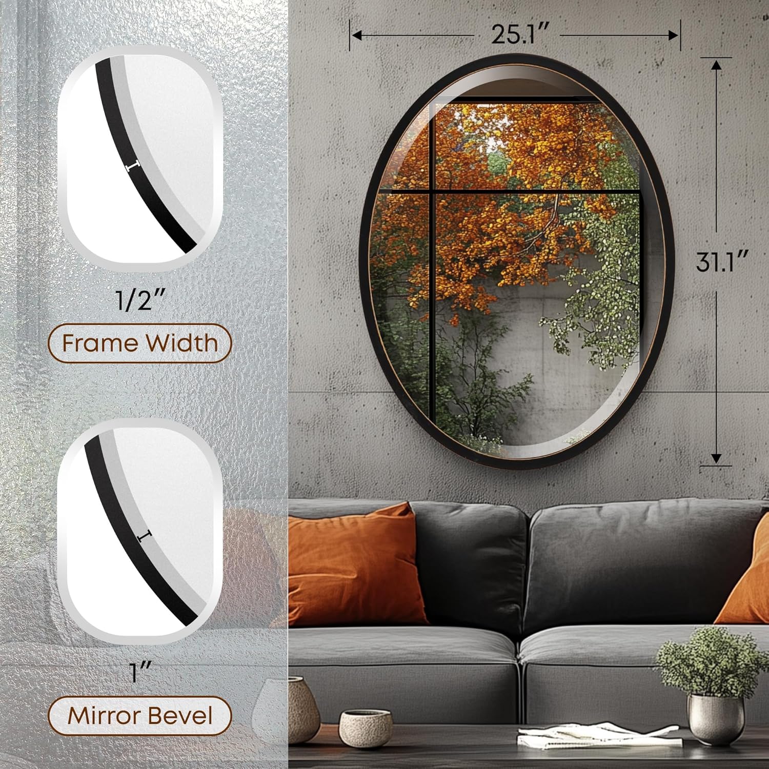 - ½” wide oval wood frame with a front-mounted mirror that appears to float. 1" beveled distortion-free mirror for added depth and clarity