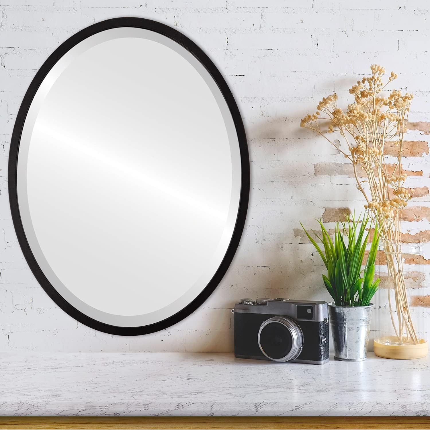 - ½” wide oval wood frame with a front-mounted mirror that appears to float. 1" beveled distortion-free mirror for added depth and clarity