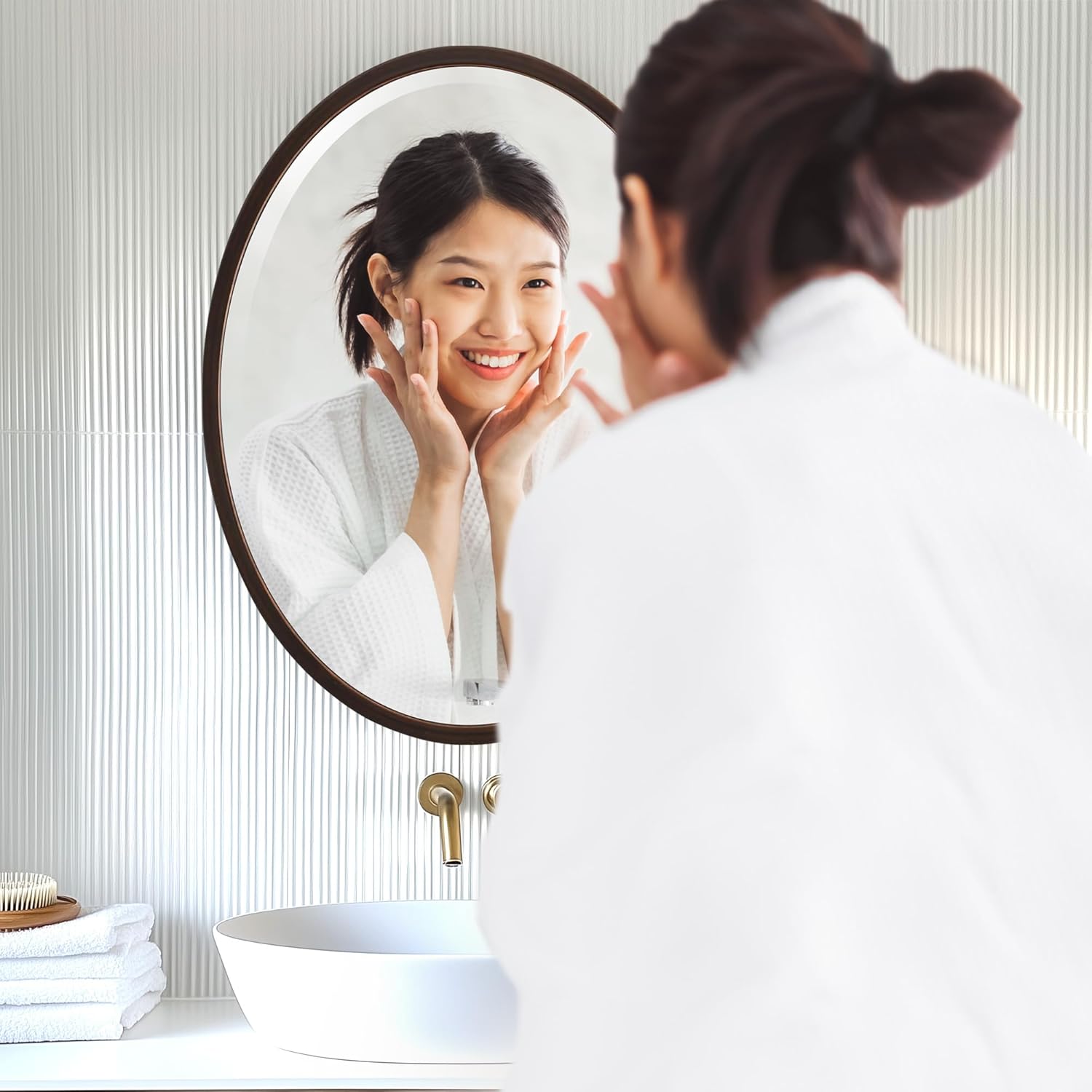 - ½” wide oval wood frame with a front-mounted mirror that appears to float. 1" beveled distortion-free mirror for added depth and clarity
