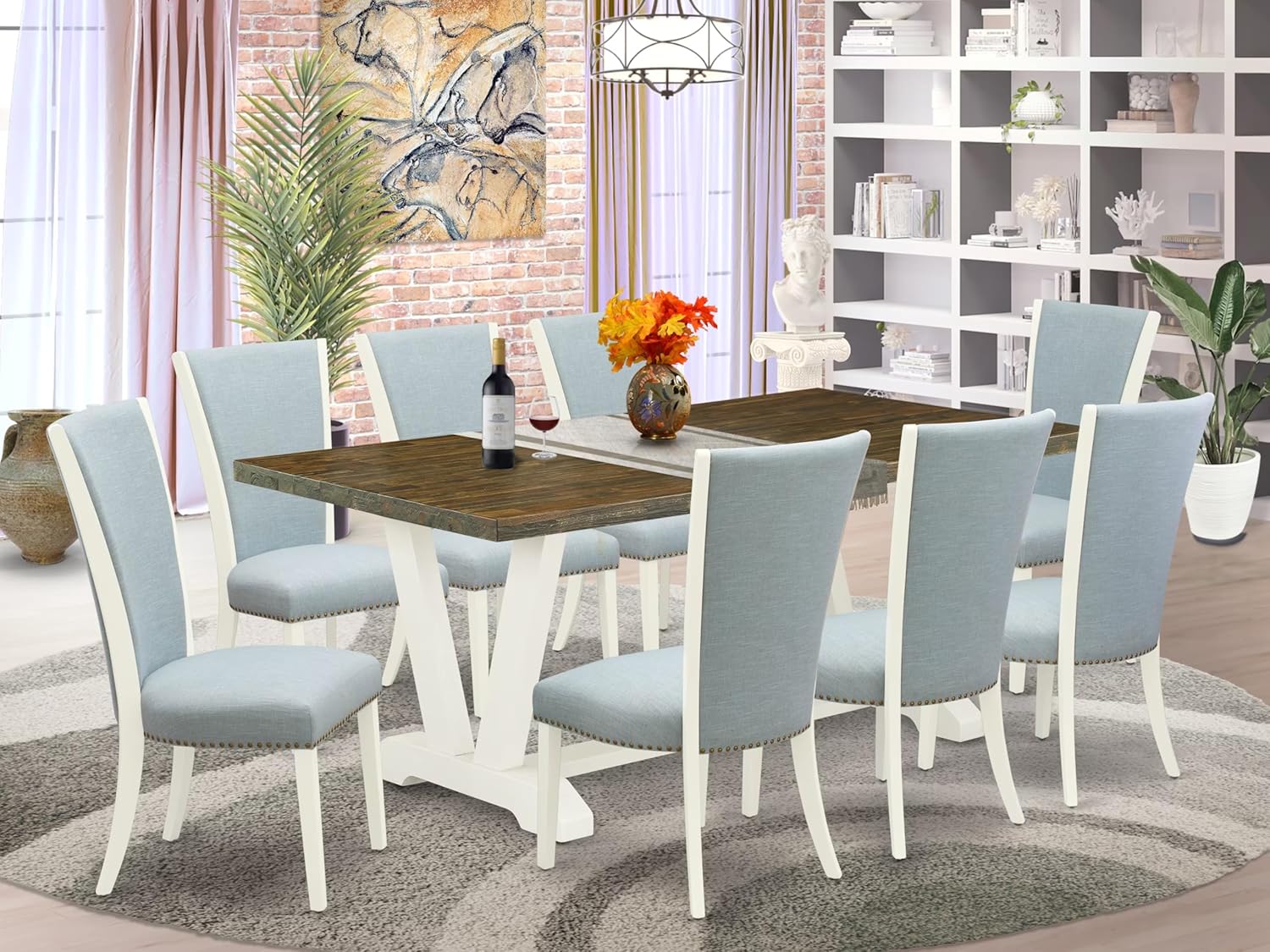 East West Furniture V077VE215-9 9 Piece Dining Room Furniture Set Includes a Rectangle Dining Table with V-Legs and 8 Baby Blue Linen Fabric Upholstered Chairs, 40x72 Inch, Multi-Color