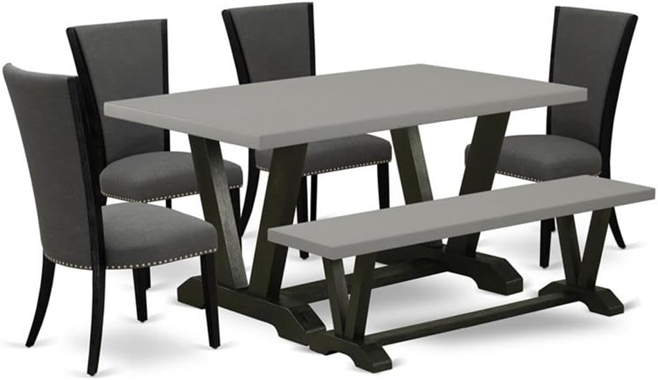 East West Furniture V696VE650-6 6 Piece Dining Set Contains a Rectangle Dining Room Table with V-Legs and 4 Dark Gotham Linen Fabric Upholstered Chairs with a Bench, 36x60 Inch, Multi-Color
