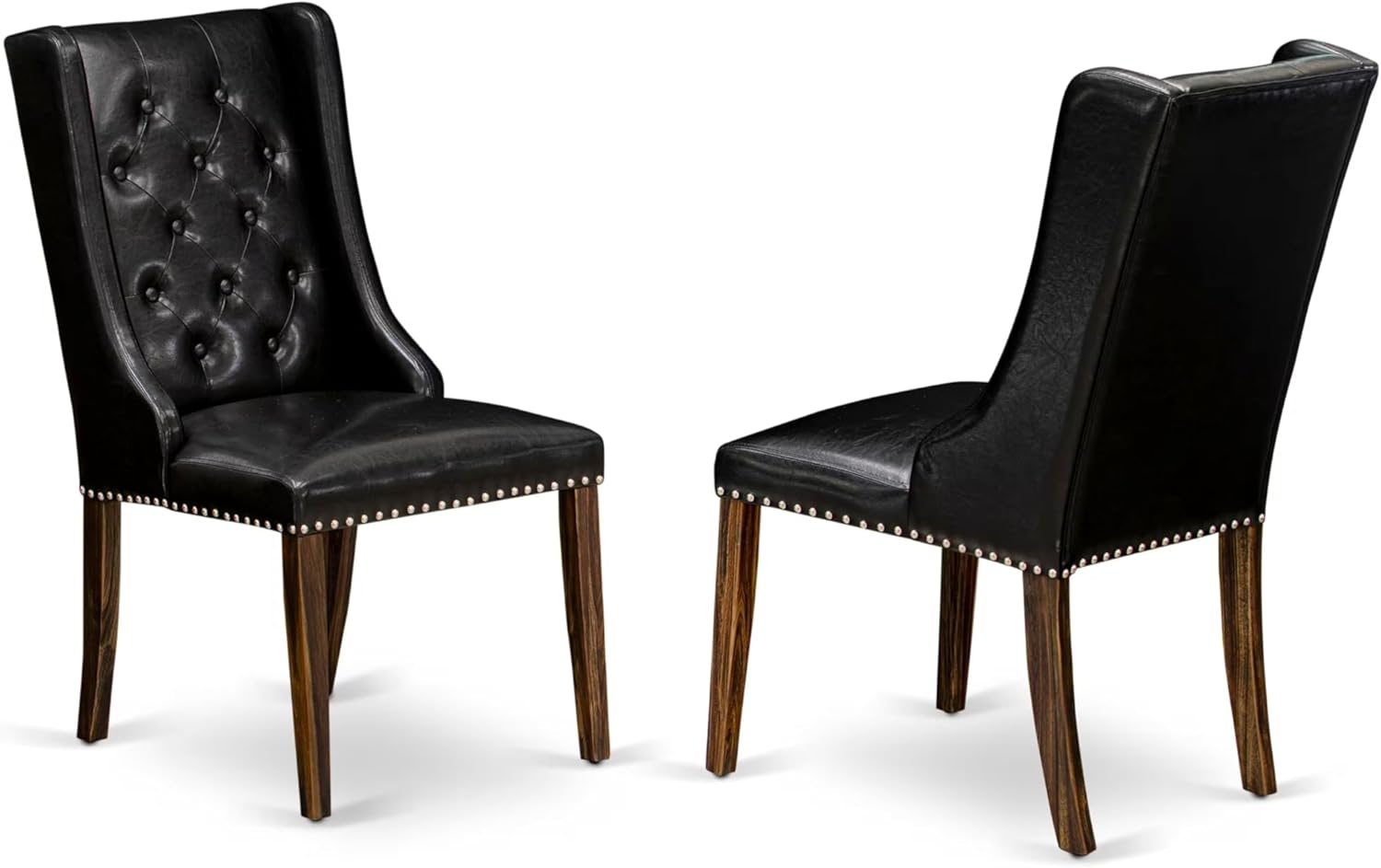 - DINING SET FINISH: Incorporating a traditional parson-style design, this dining set brings a touch of rustic charm with its Distressed Jacobean finish and tabletop. The modern flair is achieved through sleek black Pu Leather upholstery on the chairs and their clean-lined design. The coordinated color scheme between the chairs and the rectangular table adds an attractive contrast to any dining area.