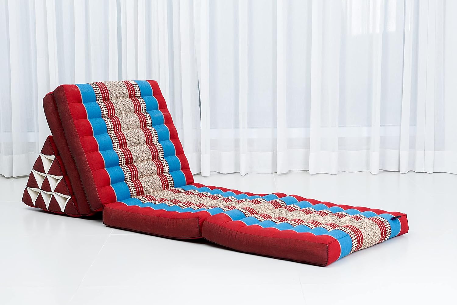 Leewadee Comfortable Japanese Floor Mattress - Thai Floor Bed with Triangle Cushion - Futon Mattress - XL Extra Long Thai Massage Mat, 89 x 20 inches, Blue Red, Kapok Filling