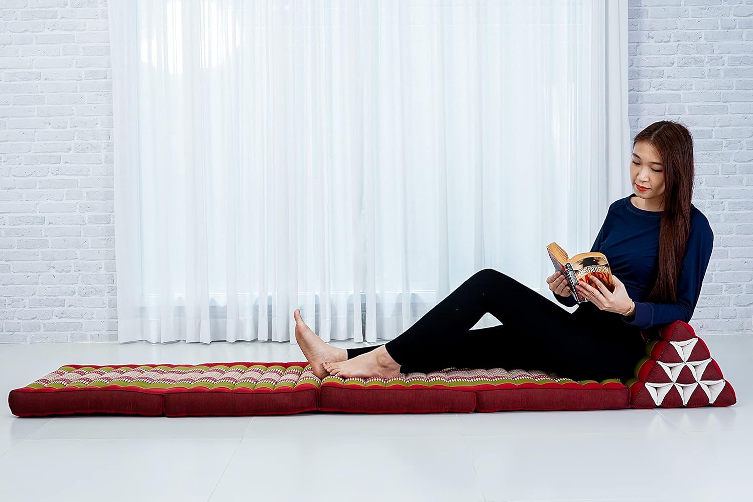 Leewadee Comfortable Japanese Floor Mattress - Thai Floor Bed with Triangle Cushion - Futon Mattress - XL Extra Long Thai Massage Mat, 89 x 20 inches, Green Red, Kapok Filling