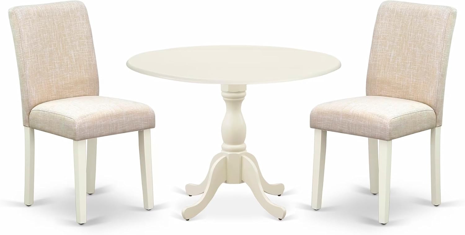East West Furniture DMAB3-LWH-02 3 Piece Dining Table Set Contains a Round Dining Room Table with Dropleaf and 2 Light Beige Linen Fabric Upholstered Chairs, 42x42 Inch, Linen White