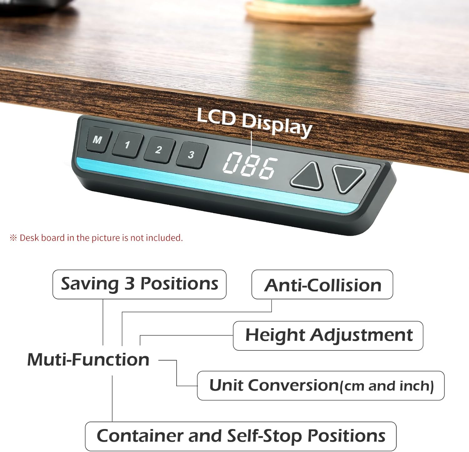- Multi-Function: Easy and convenient to adjust the comfortable height and save 3 memory positions. Anti-collision function protects desk from colliding into obstacles. LCD display clearly shows you the exact height of the desk. Unit conversion function helps you to change the unit between inch and cm. Container and self-stop positions is used to limit the movement area of desktop.