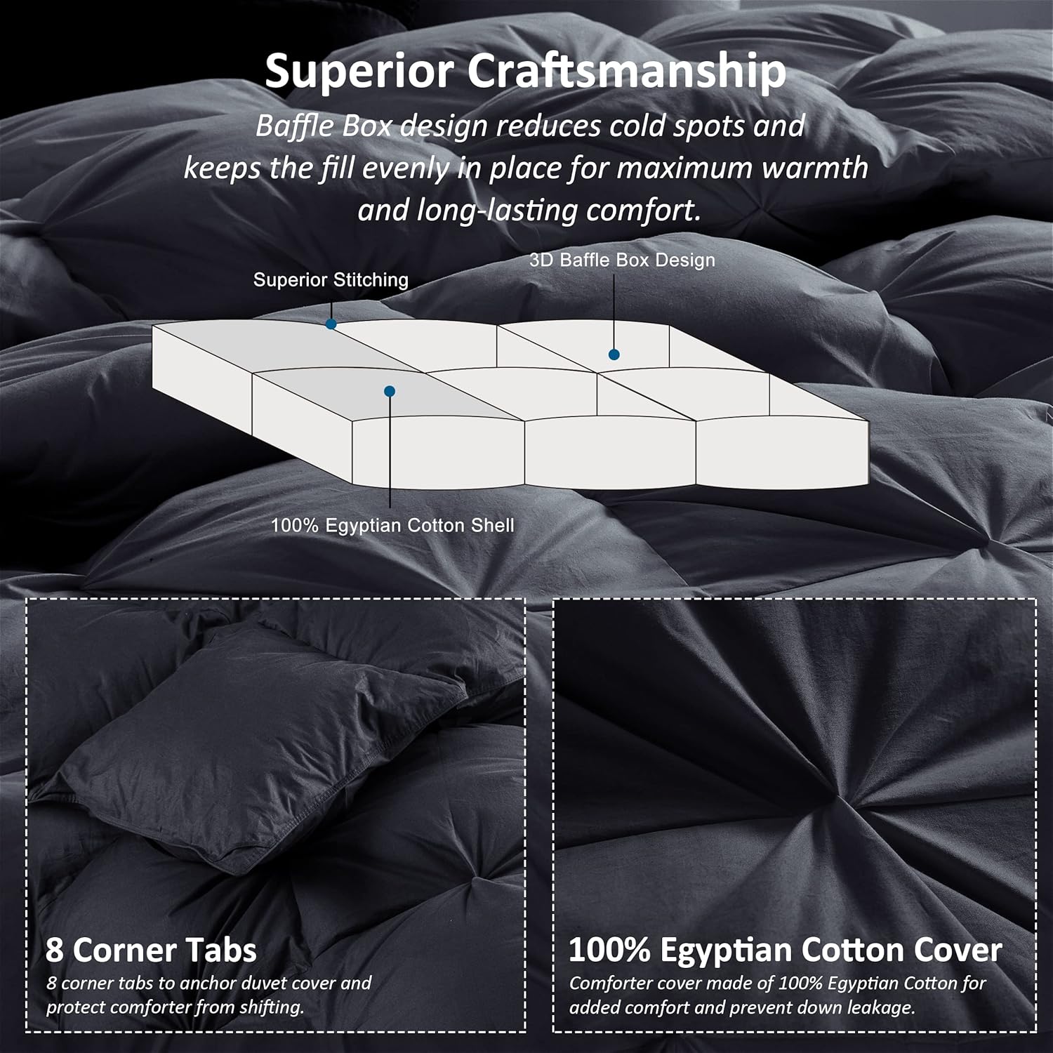 Luxurious All-Season Goose Down Feather Fiber Comforter King Size Duvet Insert, Exquisite Black Pinch Pleat Design, Premium Baffle Box, 100% Egyptian Cotton Cover, 70 oz. Fill Weight, Black