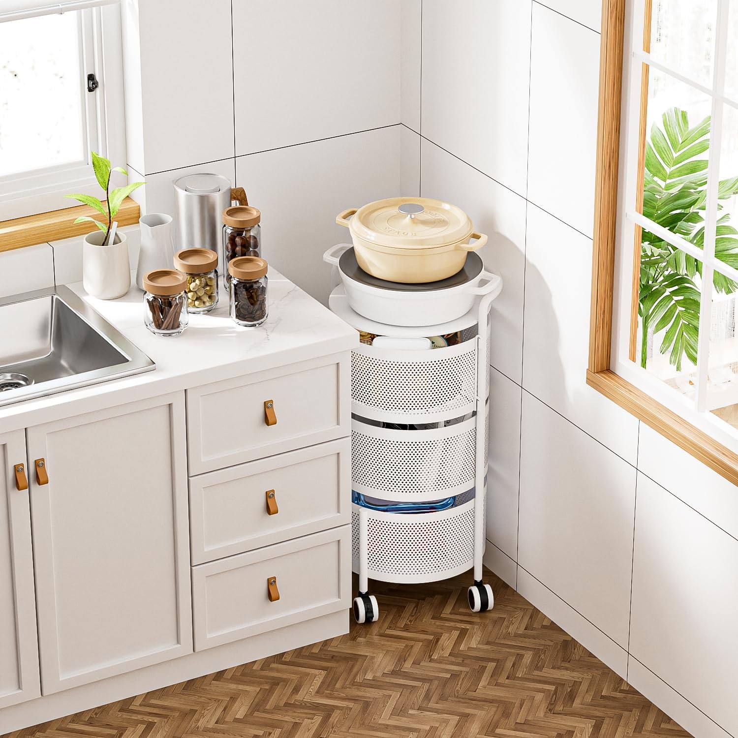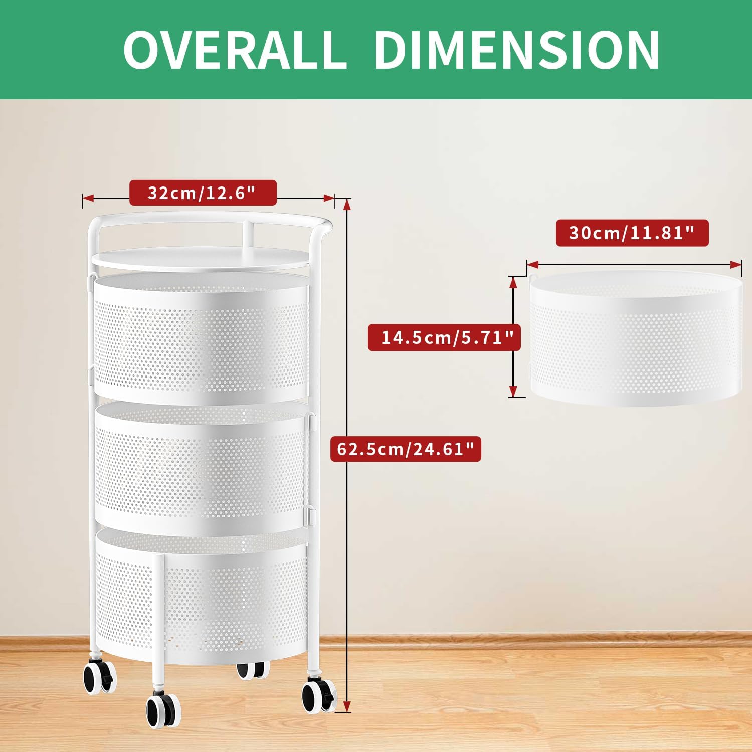 JAQ Vegetables Storage Basket, Rotating Storage Shelves Basket Carts Rack Organizer Bin on Rolling Wheels in Kitchen Household for Fruits Grocery Corns Potatos-(3-Tier,White)