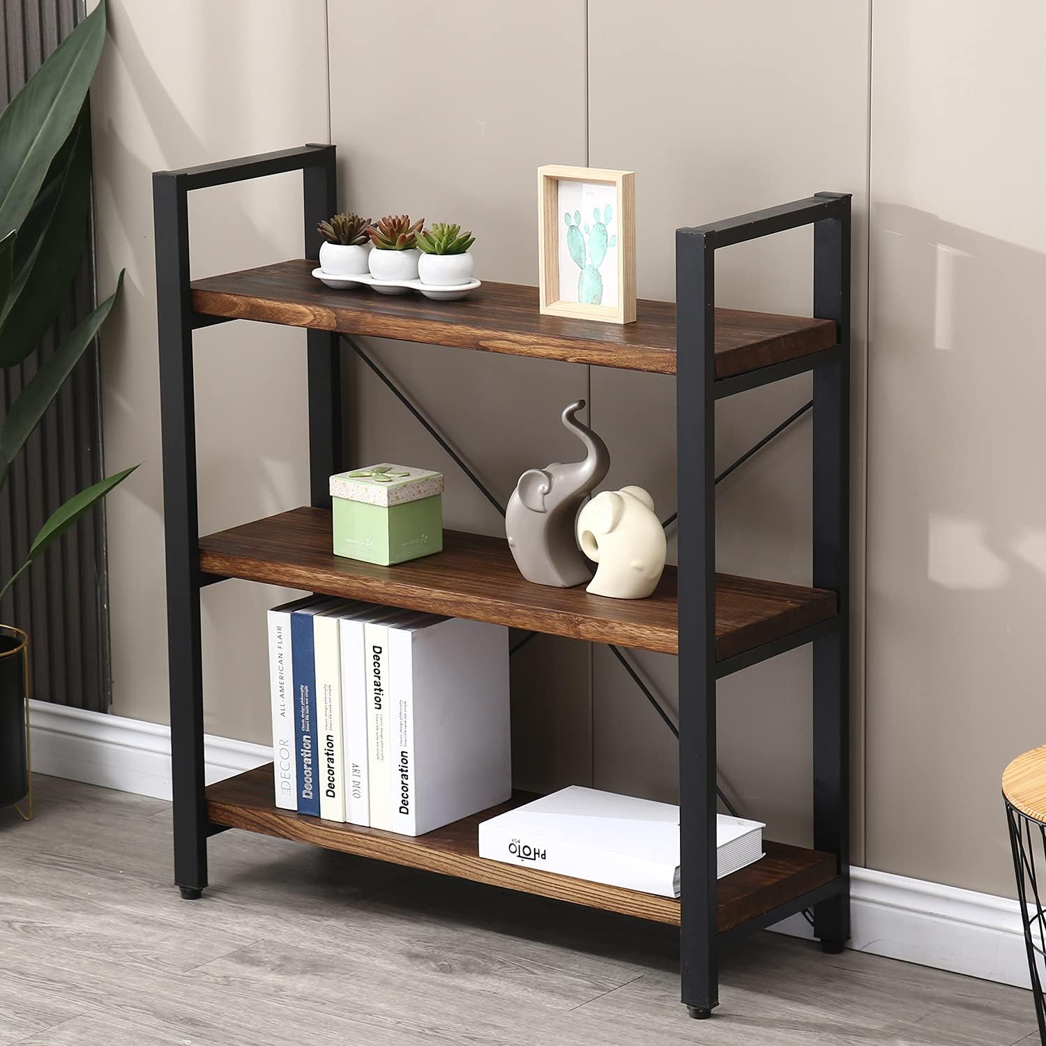 - 【MULTIFUNCTIONA BOOKSHELF】Open storage shelves design provides perfect platforms for displaying your decorations. Like family photos, novels, speakers or plants. Clean design meets rustic industrial style in this etagere bookcase, ideal for your bedroom, living room, kitchen or office.
