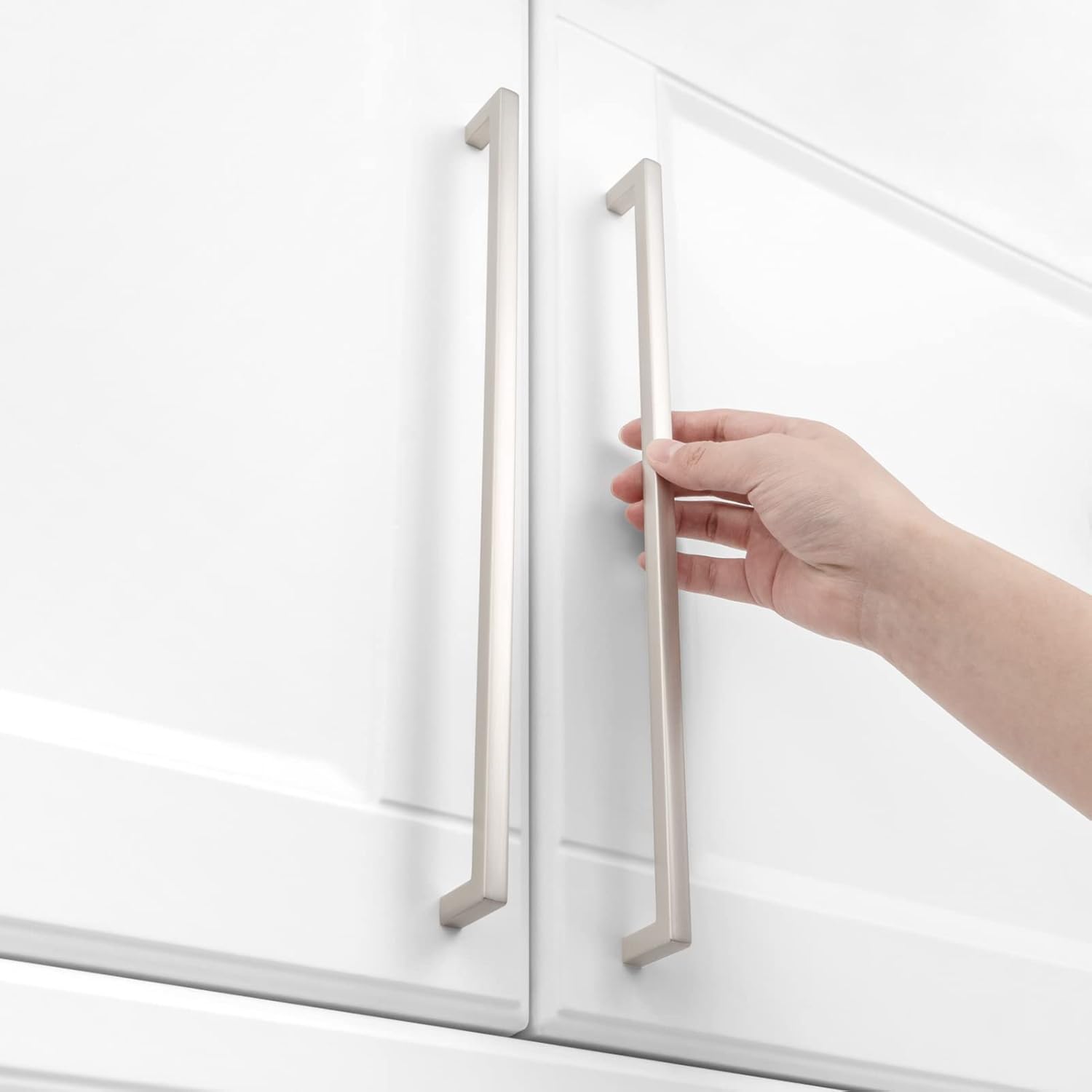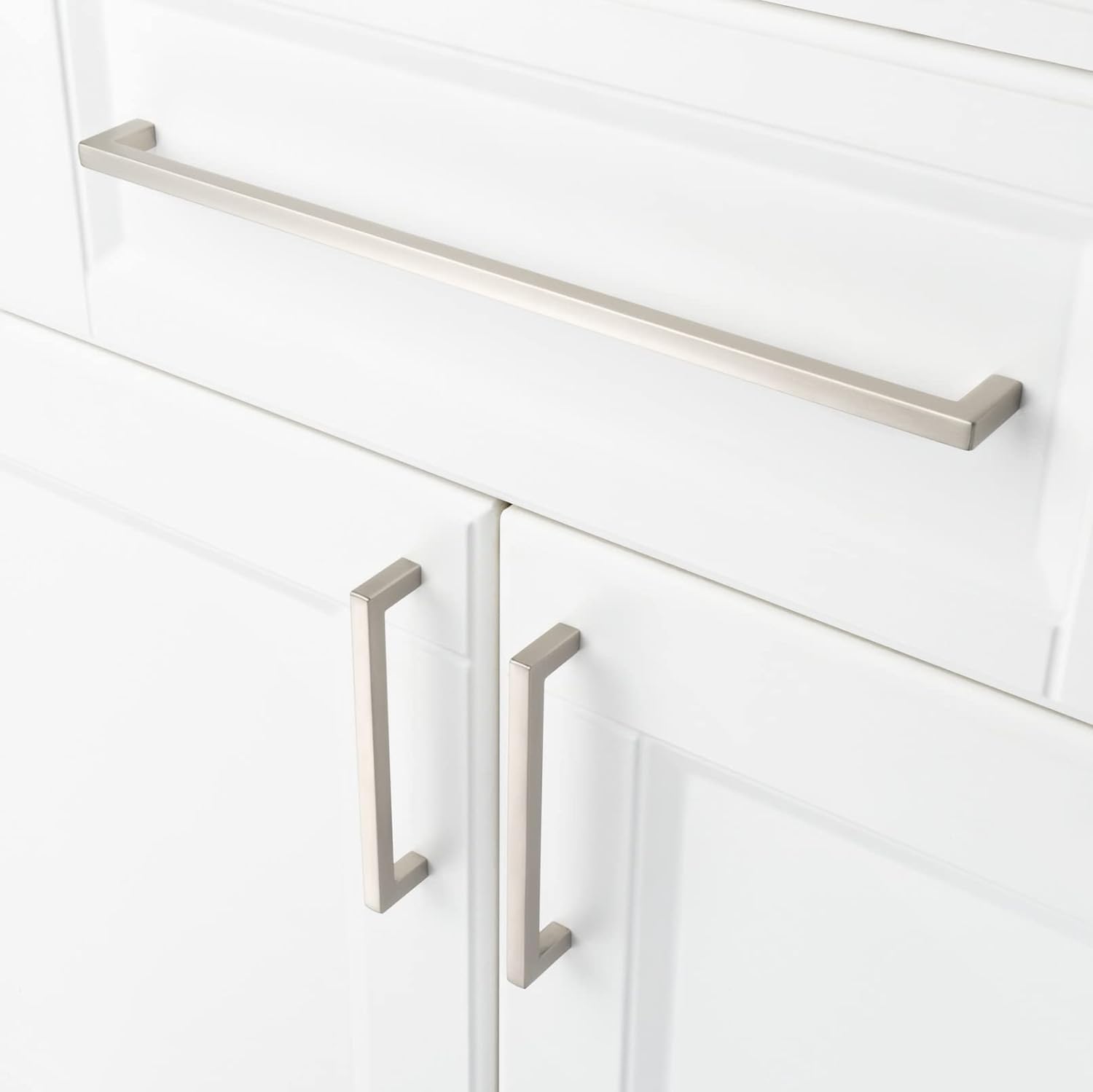 - Pack of 5 brushed nickel square bar cabinet pull handles, solid metal hardware.