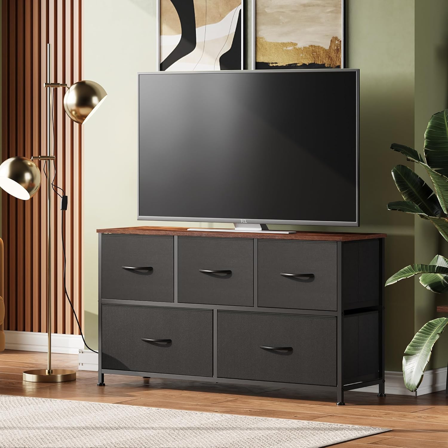 WLIVE Dresser for Bedroom with 5 Drawers, Wide Chest of Drawers, Fabric Dresser, Storage Organizer Unit with Fabric Bins for Closet, Living Room, Hallway, Black and Rustic Brown