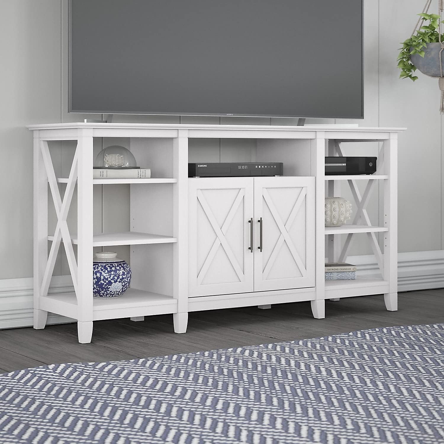 - CASUAL STYLE: Highlighted by its open design and unique X pattern accents, this modern farmhouse tv stand is a natural fit in homes that embrace a more relaxed vibe. Multiple finish options allow you to find the perfect look to complement your space.