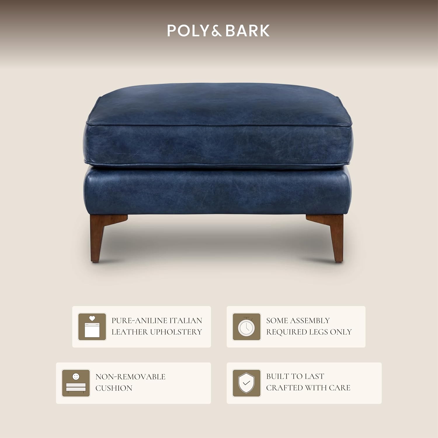 - Make Good Living Gettable: The Essex ottoman by POLY & BARK is a premium leather ottoman featuring full-grain pure-aniline or semi-aniline dyed Italian leather upholstery. Our upholstered ottoman comes in a timeless midnight blue color that highlights the natural beauty of the hide