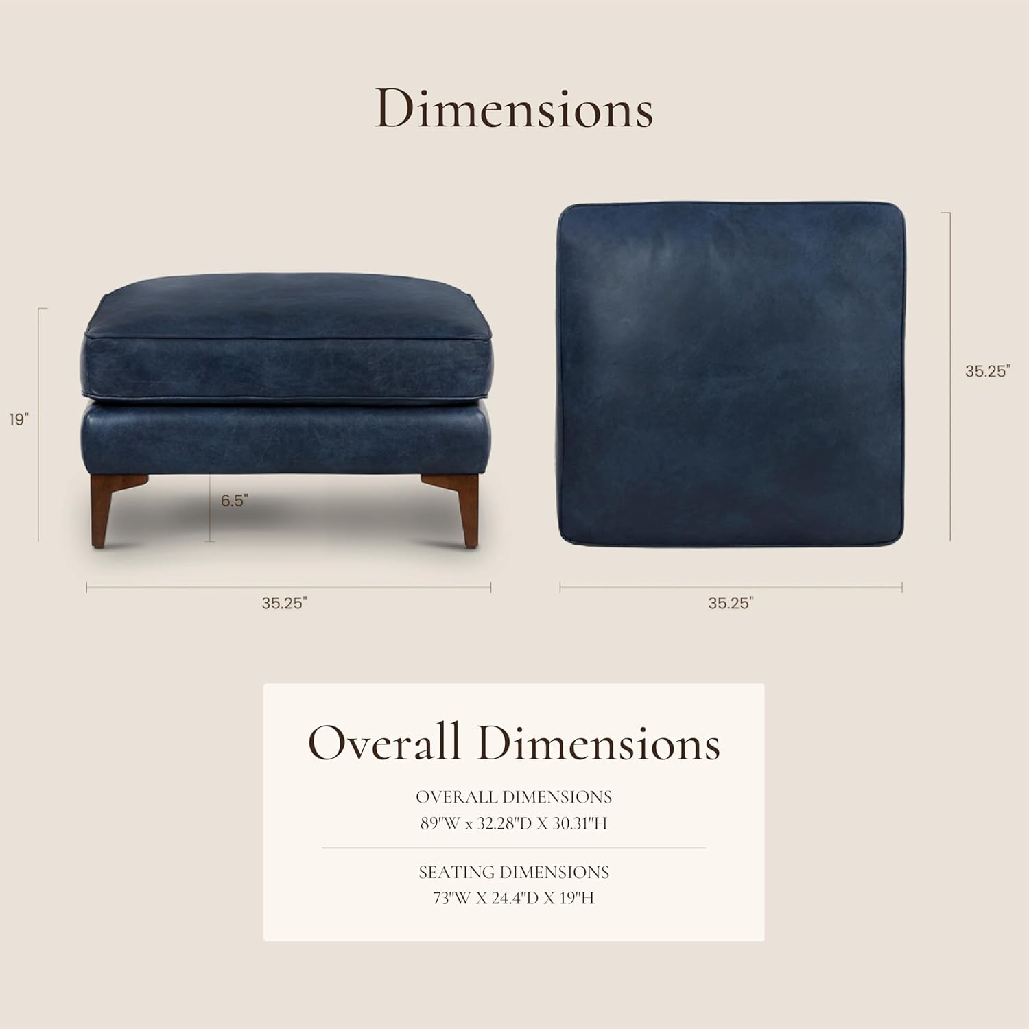 - Quality First Because Quality Lasts: Our full-grain pure-aniline Italian leather ottoman is designed with your comfort in mind, featuring a feather-down topper, webbing support, and non-removable cushions. Its solid wood legs with a walnut finish complement the blue leather, making it an ideal foot rest for the couch or ottoman for living rooms.