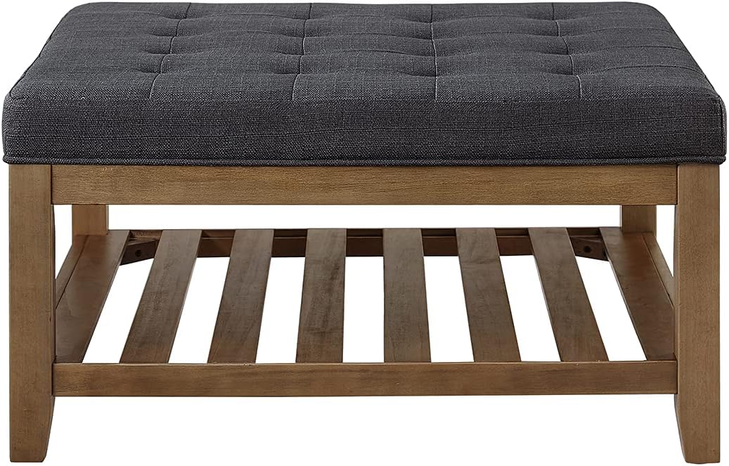 24KF Large Square Upholstered Tufted Linen Ottoman Coffee Table, Large Footrest Ottoman with Solid Wood Shelf- Charcoal
