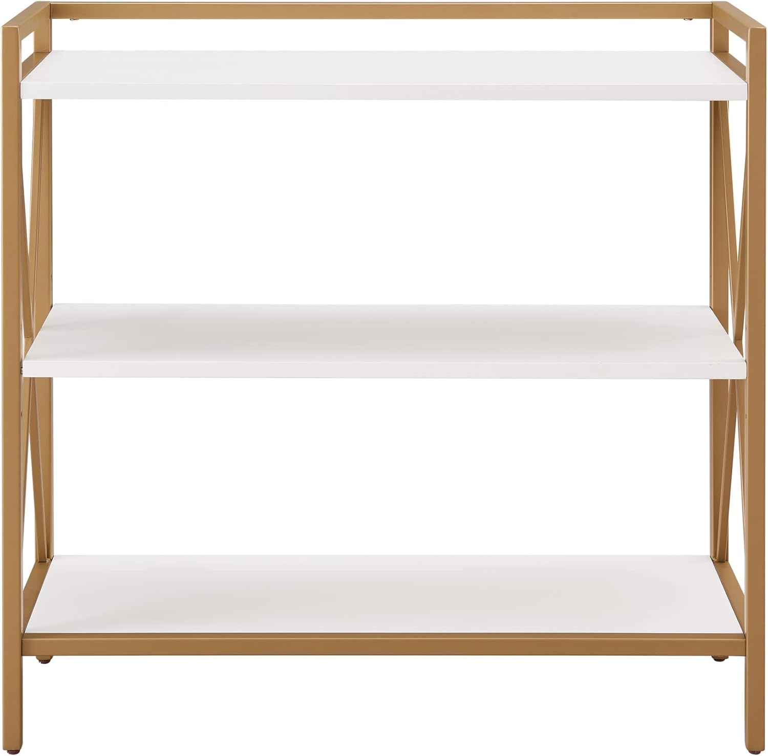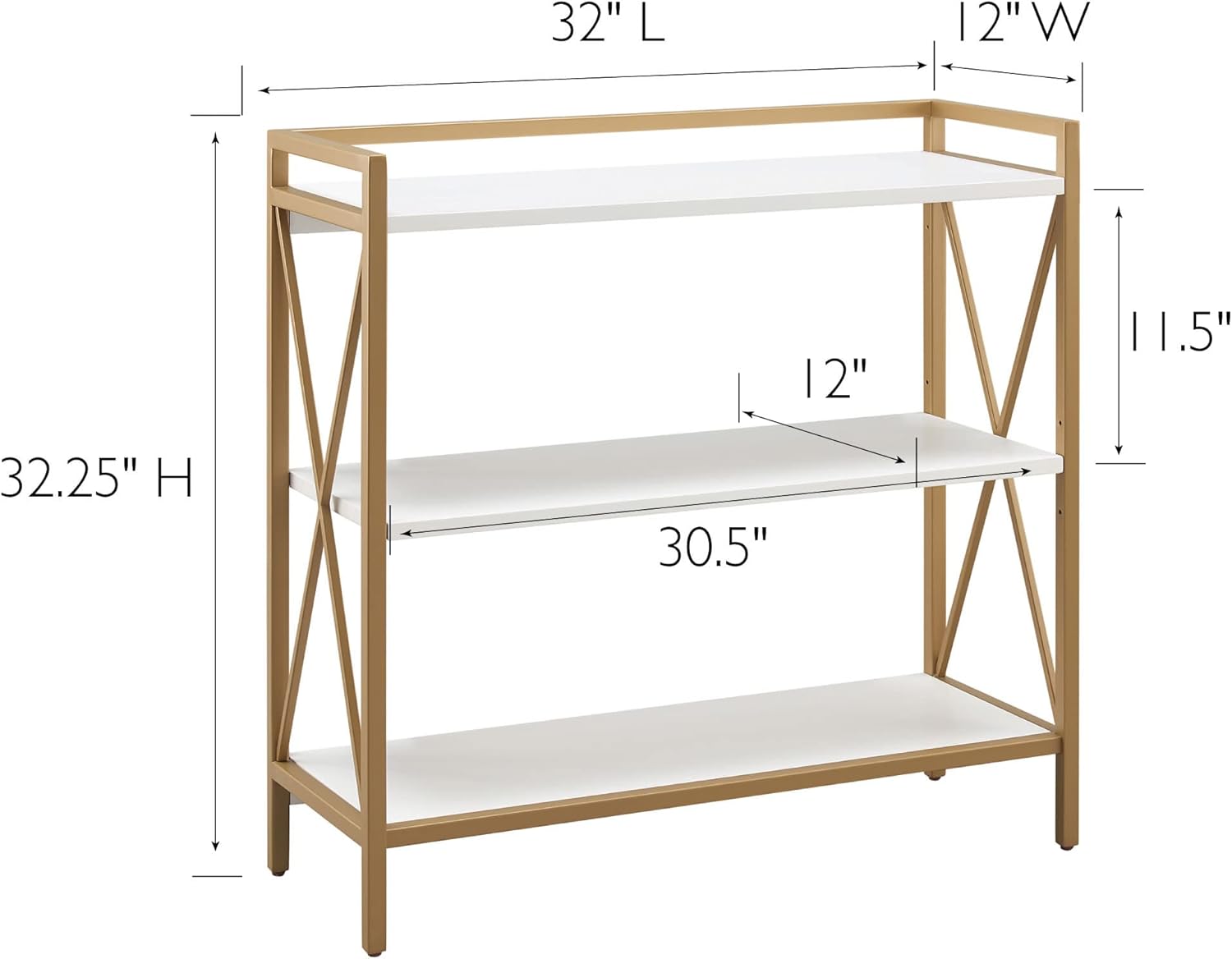 - Compact and Stylish Design: Measuring 32 inches L x 12 inches W x 32 25 inches H, the Claudette Bookshelf features a unique satin gold gallery rail and X motif metalwork, creating a chic and elegant look ideal for small spaces like apartments and condos
