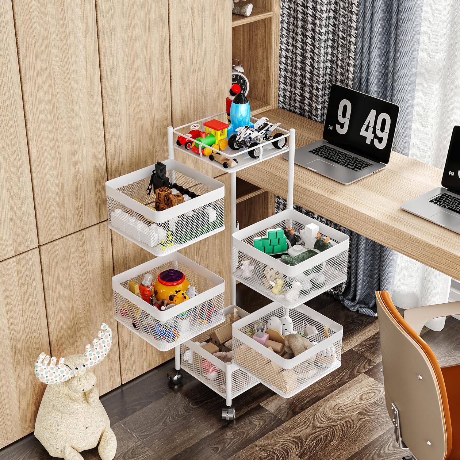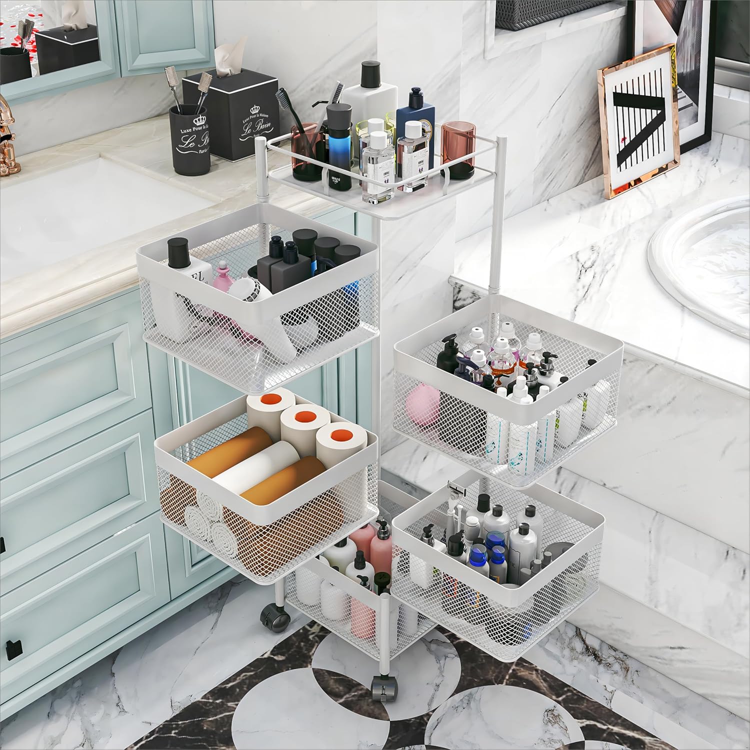 Fruit Basket for Kitchen No Assembly,Rotating Kitchen Storage Rack,Bathroom Shelf, Organizers and Storage Cart on Rolling Wheels,Potato and Onion Storage Organizer(White, 5 Tier-Square)